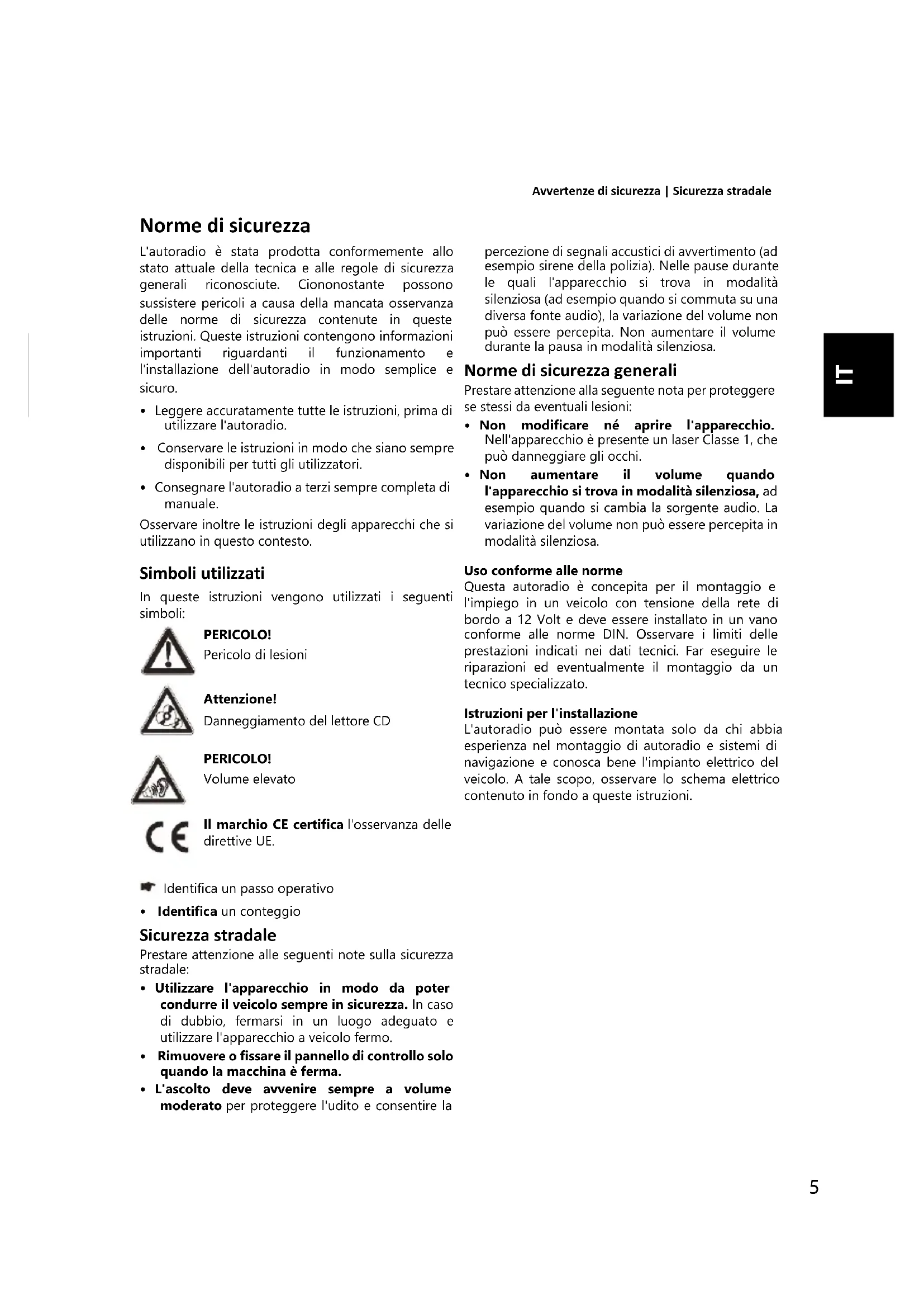 - Conservare le istruzioni in modo che siano sempre disponibili per tutti gli utilizzatori. • Consegnare l'autoradio a terzi sempre completa di manuale. Osservare inoltre le istruzioni degli apparecchi che si utilizzano in questo contesto. Simboli utilizzati In queste istruzioni vengono utilizzati i seguenti simboli: PERICOLO! Pericolo di lesioni Attenzione! Danneggiamento del lettore CD PERICOLO! Volume elevato Il marchio CE certifica l'osservanza delle direttive UE. Identifica un passo operativo