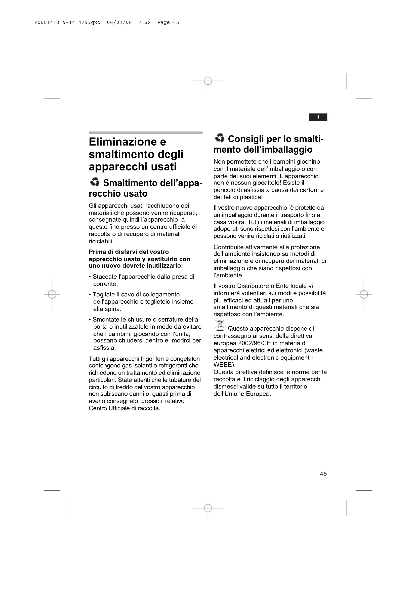 - Smontate le chiusure o serrature della porta o inutilizzatele in modo da evitare che i bambini, giocando con l’unità, possano chiudersi dentro e morirci per asfissia. Tutti gli apparecchi frigoriferi e congelatori contengono gas isolanti e refrigeranti che richiedono un trattamento ed eliminazione particolari. State attenti che le tubature del circuito di freddo del vostro apparecchio non subiscano danni o guasti prima di averlo consegnato presso il relativo Centro Ufficiale di raccolta. Consigli per lo smalti- mento dell’imballaggio Non permettete che i bambini giochino con il materiale dell’imballaggio o con parte dei suoi elementi. L’apparecchio non è nessun giocattolo! Esiste il pericolo di asfissia a causa dei cartoni e dei teli di plastica! Il vostro nuovo apparecchio è protetto da un imballaggio durante il trasporto fino a casa vostra. Tutti i materiali di imballaggio adoperati sono rispettosi con l’ambiente e possono venire riciclati o riutilizzati. Contribuite attivamente alla protezione dell’ambiente insistendo su metodi di eliminazione e di ricupero dei materiali di imballaggio che siano rispettosi con l’ambiente. Il vostro Distributore o Ente locale vi informerà volentieri sui modi e possibilità più efficaci ed attuali per uno smaltimento di questi materiali che sia rispettoso con l’ambiente. Questo apparecchio dispone di contrassegno ai sensi della direttiva europea 2002/96/CE in materia di apparecchi elettrici ed elettronici (waste electrical and electronic equipment - WEEE). Questa direttiva definisce le norme per la raccolta e il riciclaggio degli apparecchi dismessi valide su tutto il territorio dell'Unione Europea. 9000141319-141429.qxd 06/02/06 7:32 Page 4546
