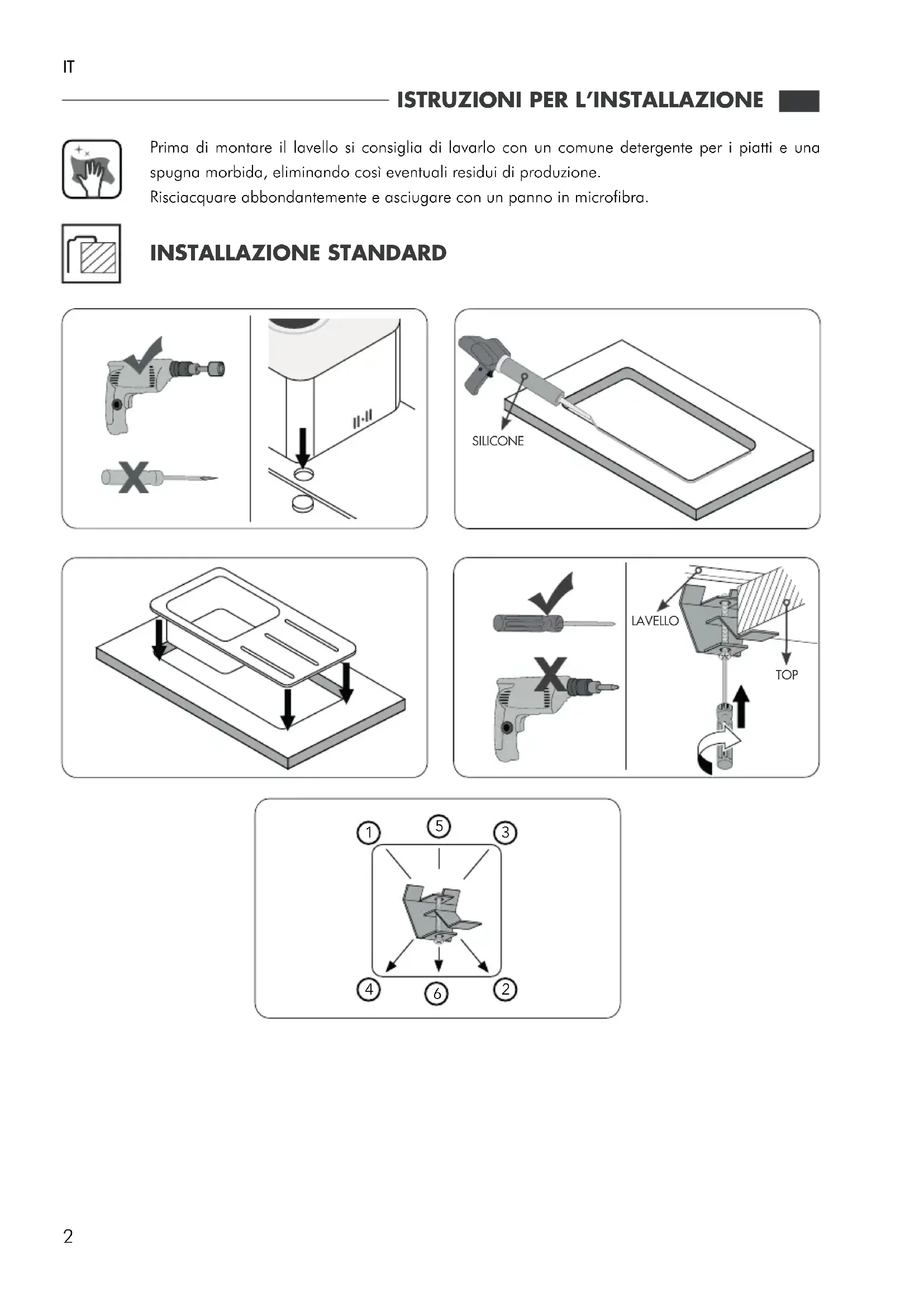 Far eseguire l’installazione e gli interventi di assistenza da personale qualificato nel rispetto delle norme vigenti. Il silicone non è in dotazione. Il lavello raffigurato nella presente guida è a scopo puramente illustrativo. INSTALLAZIONE SOTTOTOP