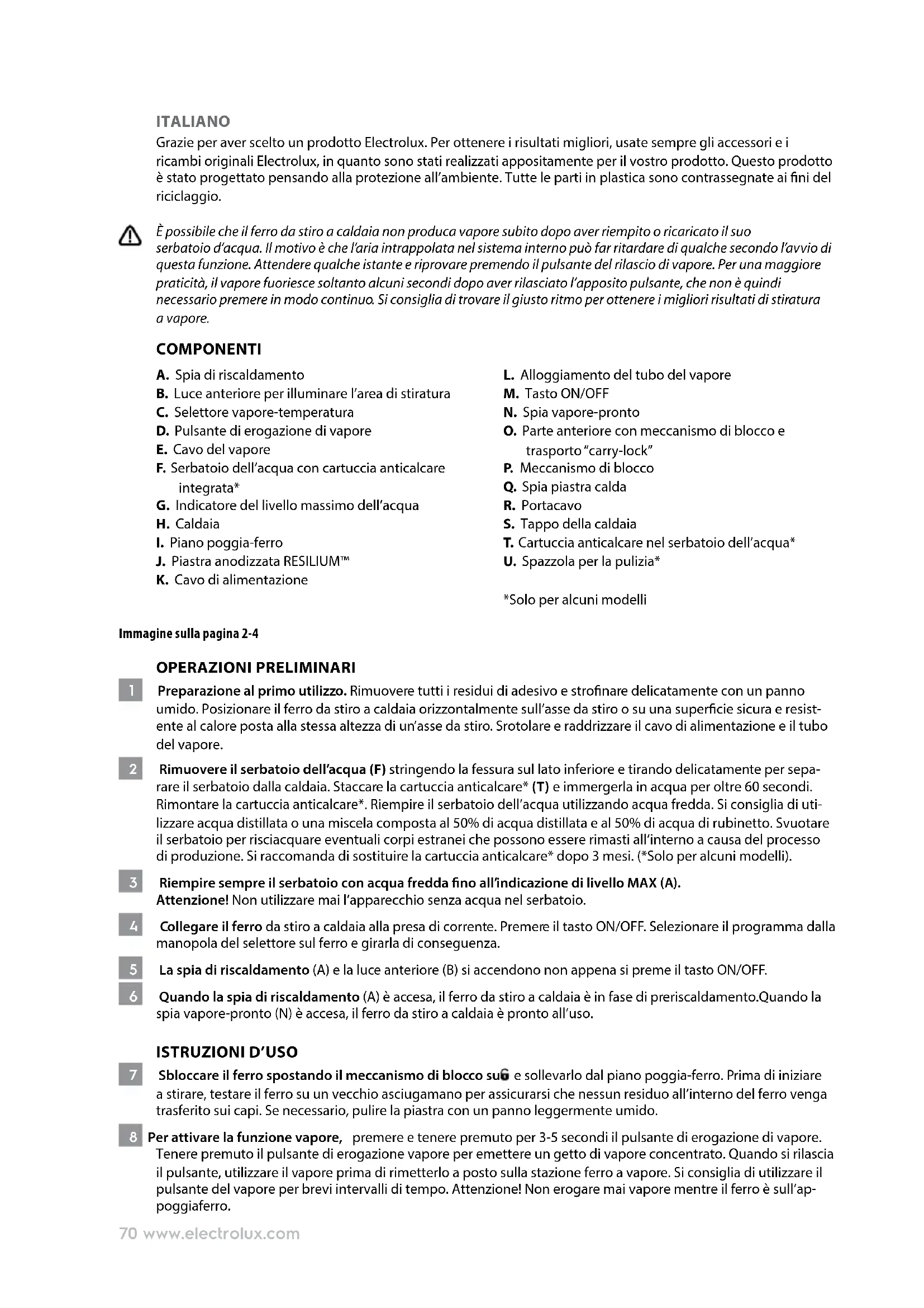 J. Piastra anodizzata RESILIUM™ K. Cavo di alimentazione L. Alloggiamento del tubo del vapore M. Tasto ON/OFF N. Spia vapore-pronto O. Parte anteriore con meccanismo di blocco e trasporto “carry-lock” P. Meccanismo di blocco Q. Spia piastra calda R. Portacavo S. Tappo della caldaia T. Cartuccia anticalcare nel serbatoio dell’acqua* U. Spazzola per la pulizia* *Solo per alcuni modelli Immagine sulla pagina 2-4 OPERAZIONI PRELIMINARI 1 Preparazione al primo utilizzo. Rimuovere tutti i residui di adesivo e stronare delicatamente con un panno umido. Posizionare il ferro da stiro a caldaia orizzontalmente sull’asse da stiro o su una supercie sicura e resist- ente al calore posta alla stessa altezza di un’asse da stiro. Srotolare e raddrizzare il cavo di alimentazione e il tubo del vapore. 2 Rimuovere il serbatoio dell’acqua (F) stringendo la fessura sul lato inferiore e tirando delicatamente per sepa- rare il serbatoio dalla caldaia. Staccare la cartuccia anticalcare* (T) e immergerla in acqua per oltre 60 secondi. Rimontare la cartuccia anticalcare*. Riempire il serbatoio dell’acqua utilizzando acqua fredda. Si consiglia di uti- lizzare acqua distillata o una miscela composta al 50% di acqua distillata e al 50% di acqua di rubinetto. Svuotare il serbatoio per risciacquare eventuali corpi estranei che possono essere rimasti all’interno a causa del processo di produzione. Si raccomanda di sostituire la cartuccia anticalcare* dopo 3 mesi. (*Solo per alcuni modelli). 3 Riempire sempre il serbatoio con acqua fredda no all’indicazione di livello MAX (A). Attenzione! Non utilizzare mai l’apparecchio senza acqua nel serbatoio. 4 Collegare il ferro da stiro a caldaia alla presa di corrente. Premere il tasto ON/OFF. Selezionare il programma dalla manopola del selettore sul ferro e girarla di conseguenza. 5 La spia di riscaldamento (A) e la luce anteriore (B) si accendono non appena si preme il tasto ON/OFF. 6 Quando la spia di riscaldamento (A) è accesa, il ferro da stiro a caldaia è in fase di preriscaldamento.Quando la spia vapore-pronto (N) è accesa, il ferro da stiro a caldaia è pronto all’uso.