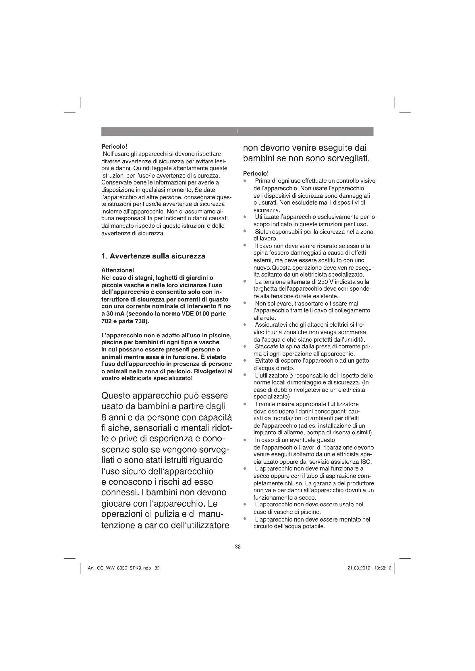 Attenzione! Nel caso di stagni, laghetti di giardini o piccole vasche e nelle loro vicinanze l’uso dell’apparecchio è consentito solo con in- terruttore di sicurezza per correnti di guasto con una corrente nominale di intervento fi no a 30 mA (secondo la norma VDE 0100 parte 702 e parte 738). L’apparecchio non è adatto all’uso in piscine, piscine per bambini di ogni tipo e vasche in cui possano essere presenti persone o animali mentre essa è in funzione. È vietato l’uso dell’apparecchio in presenza di persone o animali nella zona di pericolo. Rivolgetevi al vostro elettricista specializzato! Questo apparecchio può essere usato da bambini a partire dagli 8 anni e da persone con capacità fi siche, sensoriali o mentali ridot- te o prive di esperienza e cono- scenze solo se vengono sorveg- liati o sono stati istruiti riguardo l‘uso sicuro dell‘apparecchio e conoscono i rischi ad esso connessi. I bambini non devono giocare con l‘apparecchio. Le operazioni di pulizia e di manu- tenzione a carico dell‘utilizzatore non devono venire eseguite dai bambini se non sono sorvegliati. Pericolo!