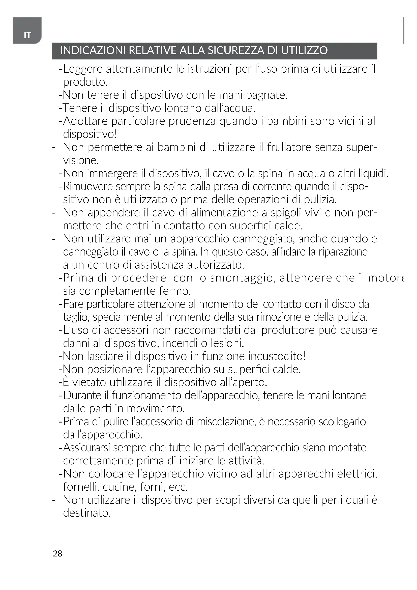 ATTENZIONE! Prima del primo ulizzo, lavare tue le par del frullatore, tranne l’alloggiamento, in acqua calda. Non bagnare l’alloggiamento del frullatore ❶. Assicurarsi che la spina di rete sia scollegata dalla presa prima di collegare o rimuovere l’apparecchiatura. Il frullatore manuale MBL-27 (28) è un apparecchio compao che semplica la preparazione dei pas quodiani. È parcolarmente adao per tritare verdure crude e coe, frua morbi- da (senza semi), preparare salse, creme, zuppe, mescolare liquidi, ecc. Tagliare gli ingredien grandi dei prodo in pezzi più piccoli (1-2 cm) prima di tritarli con un frullatore.