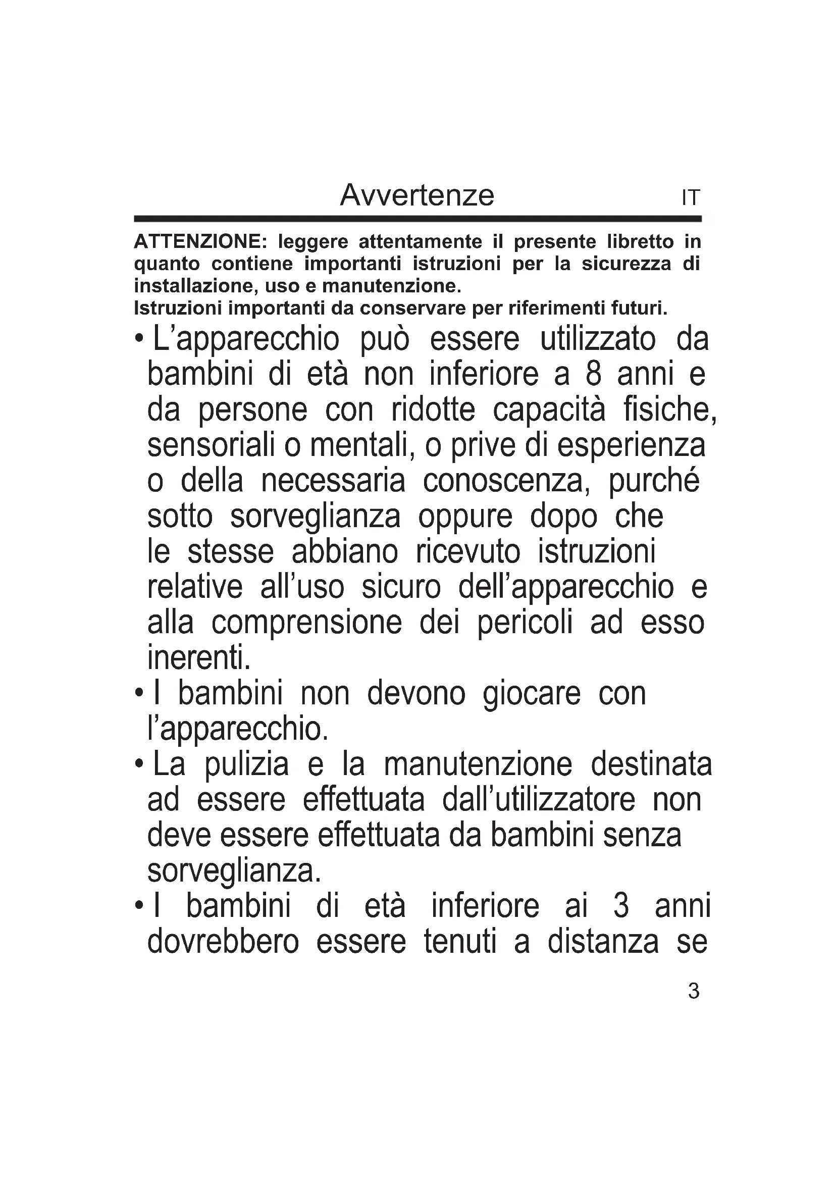 - I bambini di età compresa tra i 3 e gli 8 anni devono solamente accendere/spegnere l’apparecchio purché sia stato posto o installato nella sua normale posizione di funzionamento e che essi ricevano sorveglianza o istruzioni riguardanti l’utilizzo dell’apparecchio in sicurezza e ne capiscano i pericoli.