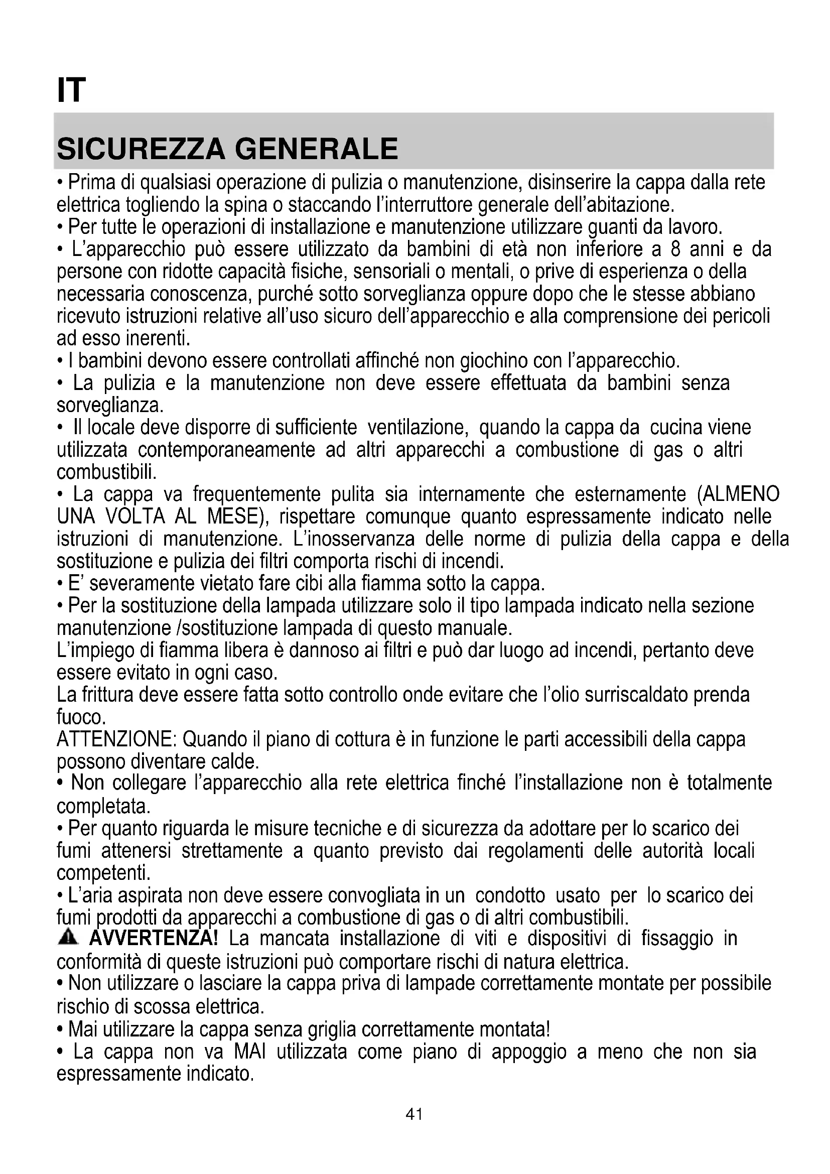 - Prima di qualsiasi operazione di pulizia o manutenzione, disinserire la cappa dalla rete elettrica togliendo la spina o staccando l’interruttore generale dell’abitazione.
