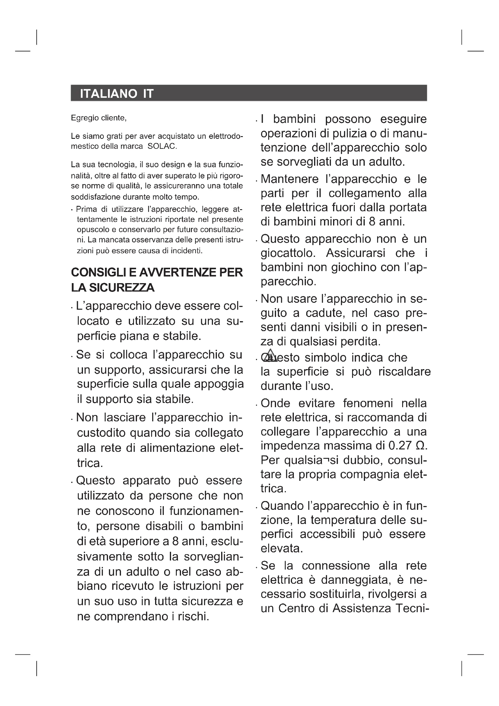 NICA Questo prodotto possiede il riconoscimento e la protezione della garanzia legale di conformità con la legislazione vigente. Per far valere i suoi diritti o interessi, dovrà rivolgersi a uno qualsiasi dei nostri servizi ufciali di assistenza tecnica. Può trovare il più vicino cliccando sul seguente link: http://solac.com Inoltre, può richiedere informazioni mettendosi in contatto con noi. Può scaricare questo manuale di istruzioni e i suoi aggiornamenti da http://solac.com