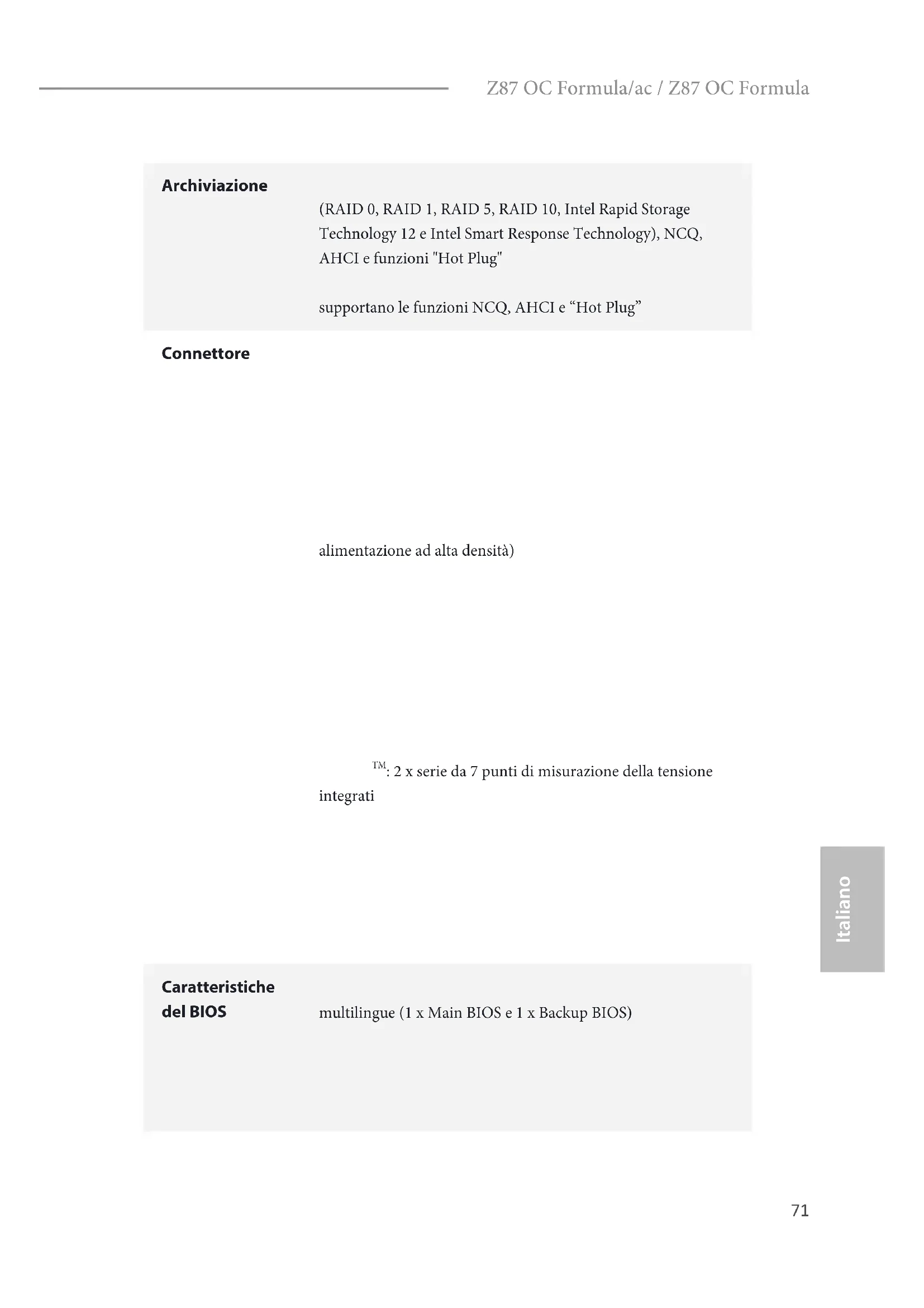 Z87 OC Formula/ac / Z87 OC Formula 1 Introduzione Congratulazioni per l’acquisto della scheda madre ASRock Z87 OC Formula/ac / Z87 OC Forrmula, una scheda madre adabile prodotta secondo i severissimi controlli di qualità ASRock. La scheda madre ore eccellenti prestazioni con un design robusto che si adatta all'impegno di ASRock di orire sempre qualità e durata.