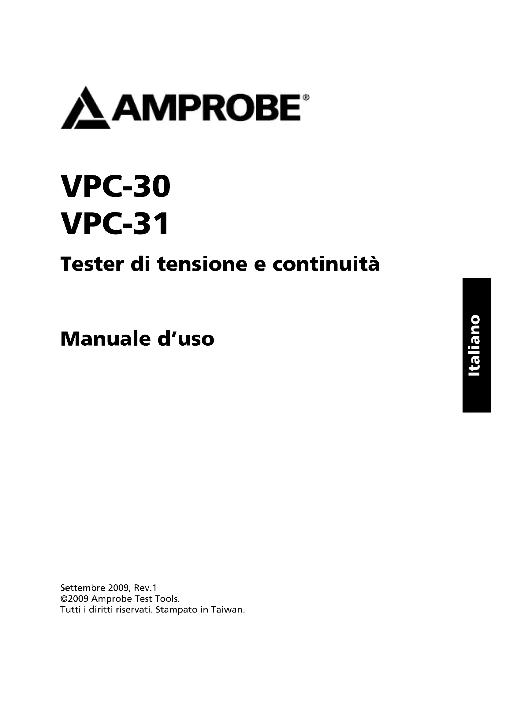 Bedienung zu erkennen. Außer dem Ersetzen der Batterie sollten Reparaturen am Messgerät ausschließlich durch werkseitig autorisiertes Servicepersonal oder anderes Fachpersonal durchgeführt werden. Die Vorderseite und das Gehäuse können mit einer milden Lösung von Reinigungsmittel und Wasser gereinigt werden. Die Lösung spärlich mit einem weichen Tuch auftragen und das Gerät vor Gebrauch vollständig trocknen lassen. Keine aromatischen Kohlenwasserstoffe oder Chlorlösungsmittel zur Reinigung verwenden.13 Abb. 1 Abb. 3 Abb. 4 Abb. 2VPC-30 VPC-31 Tester di tensione e continuità Manuale d’uso Settembre 2009, Rev.1 ©2009 Amprobe Test Tools. Tutti i diritti riservati. Stampato in Taiwan. ItalianoGaranzia limitata e limitazione di responsabilità Questo prodotto Amprobe sarà esente da difetti di materiale e fabbricazione per un anno a decorrere dalla data di acquisto. Sono esclusi da questa garanzia i fusibili, le pile monouso e i danni causati da incidenti, negligenza, uso improprio, alterazione, contaminazione o condizioni anomale di funzionamento o manipolazione. I rivenditori non sono autorizzati a offrire nessun’altra garanzia a nome della Amprobe. Per richiedere un intervento durante il periodo di garanzia, restituire il prodotto, allegando la ricevuta di acquisto, a un centro di assistenza autorizzato Amprobe Test Tools oppure a un rivenditore o distributore Amprobe locale. Per ulteriori informazioni vedere la sezione Riparazioni. QUESTA GARANZIA È IL SOLO RICORSO A DISPOSIZIONE DELL’ACQUIRENTE, E SOSTITUISCE QUALSIASI ALTRA GARANZIA, ESPRESSA, IMPLICITA O PREVISTA DALLA LEGGE, COMPRESA, MA NON A TITOLO ESCLUSIVO, QUALSIASI GARANZIA IMPLICITA DI COMMERCIABILITÀ O DI IDONEITÀ PER SCOPI PARTICOLARI. IL PRODUTTORE NON SARÀ RESPONSABILE DI DANNI O PERDITE SPECIALI, INDIRETTI O ACCIDENTALI, DERIVANTI DA QUALSIASI CAUSA O TEORIA. Poiché alcuni stati o paesi non permettono l’esclusione o la limitazione di una garanzia implicita o di danni accidentali o indiretti, questa limitazione di responsabilità potrebbe non riguardare l’acquirente. Riparazioni A tutti gli strumenti di misura restituiti per interventi in garanzia non coperti dalla garanzia oppure per la taratura, devono essere allegate le seguenti informazioni: il proprio nome e quello dell’azienda, indirizzo, numero telefonico e ricevuta di acquisto. Allegare anche una breve descrizione del problema o dell’intervento richiesto e i cavi di misura. Gli importi dovuti per sostituzioni o riparazioni non coperte dalla garanzia vanno versati tramite assegno, vaglia bancario, carta di credito con data di scadenza, oppure ordine di acquisto all’ordine di Amprobe