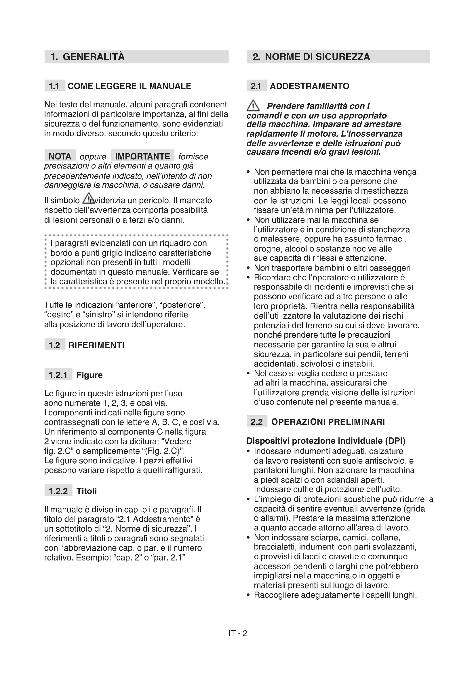 Nel testo del manuale, alcuni paragra contenenti informazioni di particolare importanza, ai ni della sicurezza o del funzionamento, sono evidenziati in modo diverso, secondo questo criterio: NOTA oppure IMPORTANTE fornisce precisazioni o altri elementi a quanto già precedentemente indicato, nell’intento di non danneggiare la macchina, o causare danni. Il simbolo evidenzia un pericolo. Il mancato rispetto dell’avvertenza comporta possibilità di lesioni personali o a terzi e/o danni. I paragra evidenziati con un riquadro con bordo a punti grigio indicano caratteristiche opzionali non presenti in tutti i modelli documentati in questo manuale. Vericare se la caratteristica è presente nel proprio modello. Tutte le indicazioni “anteriore”, “posteriore”, “destro” e “sinistro” si intendono riferite alla posizione di lavoro dell’operatore.
