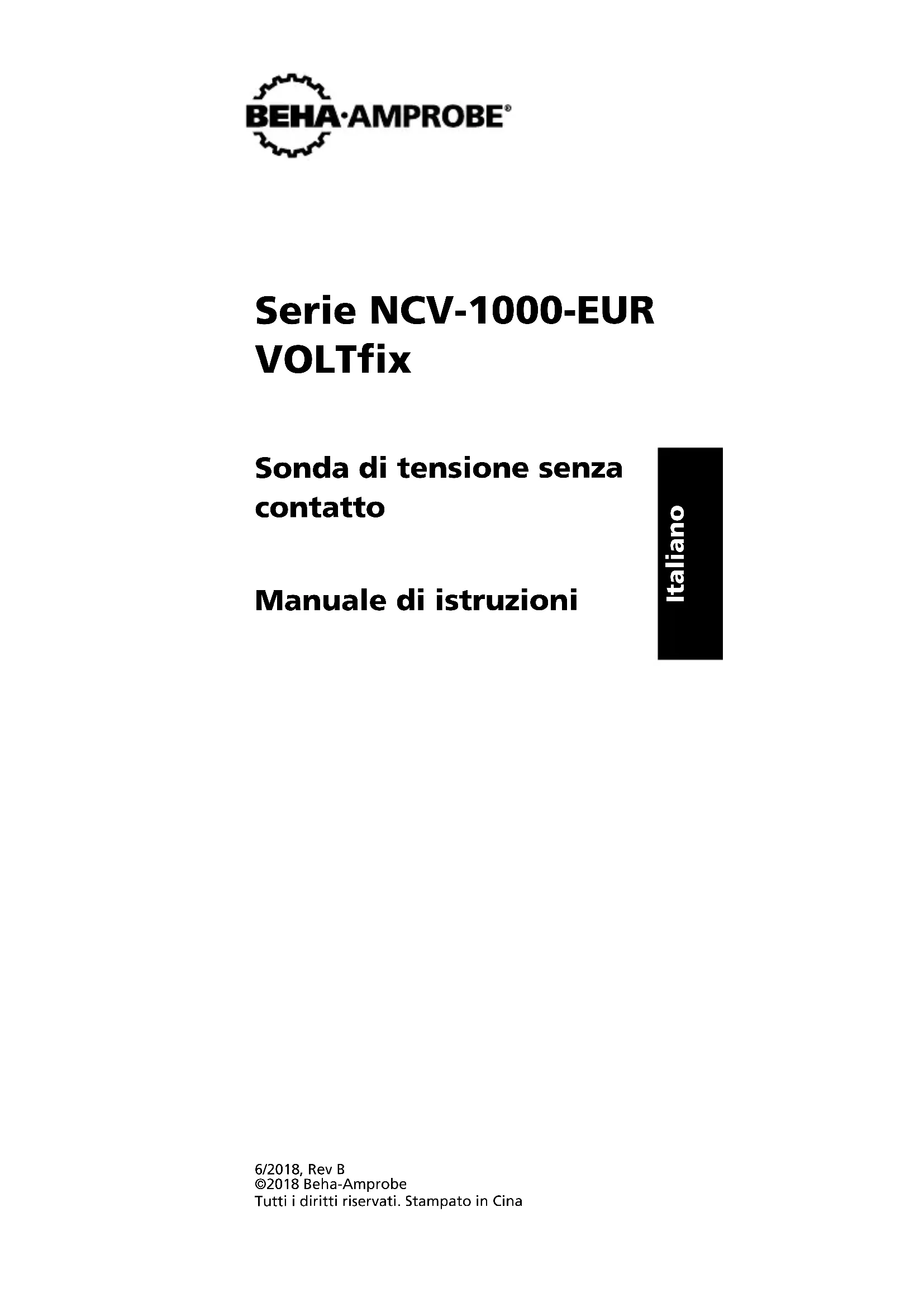 Indicateur de piles faibles La sonde de tension NCV-1030/1040-EUR (MAGNO-)VOLTx fournit une indication de piles faibles sous la forme d'une LED rouge clignotant très lentement à la mise sous tension lorsque le niveau des piles est faible et les piles doivent être remplacées. À ce stade, aucune indication de la tension n'est possible. Le NCV-1020-EUR VOLTx ne fournit pas la même indication; au lieu de cela, les piles devront être remplacées si aucune LED n'apparaît à la mise sous tension. Remplacement des piles Pour retirer le couvercle des piles, utilisez la prise de pouce pour le tirer vers le haut et vers l'extérieur. Retirez les piles et remplacez-les par (2) piles alcalines AAA 1,5V, en notant l'orientation des piles comme indiqué sur le côté de la sonde de tension. Remettez le couvercle. Si la sonde de tension ne va pas être utilisée pendant une longue durée, enlevez les piles. Couvercle des piles Verrouillage7 8 Nettoyage La sonde de tension peut être nettoyée avec une solution douce d'eau savonneuse. Appliquer en petite quantité avec un chiffon doux et laisser sécher complètement avant utilisation. Ne pas utiliser d'hydrocarbures aromatiques, d'essence ou de solvants chlorés pour le nettoyage.Serie NCV-1000-EUR VOLTfix Sonda di tensione senza contatto Manuale di istruzioni 6/2018, Rev B ©2018 Beha-Amprobe Tutti i diritti riservati. Stampato in Cina ItalianoGaranzia limitata e limitazione di responsabilità Il vostro prodotto Beha-Amprobe sarà libero da difetti nei materiali e nella manodopera per un anno dalla data di acquisto a meno che le leggi locali non prevedano condizioni diverse. Questa garanzia non copre fusibili, batterie ricaricabili o danni dovuti a incidenti, negligenza, cattivo uso, modiche, contaminazione o condizioni anomale di utilizzo o gestione. I rivenditori non sono autorizzati a estendere nessuna garanzia per conto di Beha-Amprobe. Per ottenere assistenza durante il periodo di garanzia, restituire il prodotto insieme alla prova d'acquisto a un centro di assistenza autorizzato Beha- Amprobe o a un rivenditore o distributore Beha-Amprobe. Per i dettagli, vedere la sezione sulle riparazioni. QUESTA GARANZIA È IL VOSTRO UNICO RIMEDIO. TUTTE LE ALTRE GARANZIE, SIANO ESSE ESPRESSE, IMPLICITE O PER LEGGE, INCLUSE QUELLE INPLICITE DI ADEGUATEZZA PER UNO SCOPO PARTICOLARE O PER LA COMMERCIABILITÀ, SONO QUI ESCLUSE. IL PRODUTTORE NON PUÒ ESSERE RITENUTO RESPONSABILE DI EVENTUALI DANNI SPECIALI, INDIRETTI, ACCIDENTALI O CONSEQUENZIALI O DI PERDITE DERIVANTI DA QUALSIASI CAUSA O TEORIA. Poiché alcuni paesi o stati non consentono l'esclusione o la limitazione di una garanzia implicita o di danni accidentali o consequenziali, tale limitazione di responsabilità potrebbe non essere applicabile in tutti i casi. Riparazione Tutti i prodotti Beha-Amprobe restituiti per la riparazione in garanzia o non in garanzia o per la taratura, devono essere accompagnati da quanto segue:il nome del cliente, il nome della società, l'indirizzo, il numero di telefono e la prova d'acquisto. Inoltre, è necessario includere una breve descrizione del problema o del servizio richiesto e includere i contatti di prova e il contatore. La riparazione non in garanzia o i costi di sostituzione devono essere corrisposti in forma di assegno, vaglia, carta di credito con data di scadenza o con ordine d'acquisto pagabile ad Beha- Amprobe. Riparazioni e sostituzioni in garanzia - Tutti i paesi Leggere le dichiarazioni di garanzia e controllare la batteria prima di richiedere una riparazione. Durante il periodo di garanzia, tutti gli strumenti di prova difettosi possono essere restituiti al proprio distributore Beha- Amprobe per essere cambiati con un prodotto uguale o simile. Controllare la sezione “Where to Buy” (Dove acquistare) sul sito www.beha-amprobe.com per un elenco dei distributori più vicini. Inoltre, negli USA e in Canada, è possibile inviare i prodotti per le riparazioni in garanzia e la sostituzione anche presso un centro di assistenza Amprobe (vedere indirizzo in basso). Riparazioni e sostituzioni non coperte da garanzia - USA e Canada Per le riparazioni non coperte da garanzia negli USA e in Canada è necessario inviare i prodotti presso un centro di assistenza Amprobe. Chiamare Amprobe oppure il proprio punto d'acquisto per conoscere le attuali tariffe di riparazione e sostituzione. USA: Canada: Amprobe Amprobe Everett, WA 98203 Mississauga, ON L4Z 1X9 Tel: 877-AMPROBE (267-7623) Tel: 905-890-7600Riparazioni e sostituzioni non coperte da garanzia - Europa Le unità non coperte da garanzia in Europa possono essere sostituite dal proprio distributore a fronte di un costo nominale. Visitare la sezione "Where to buy" (Dove acquistare) sul sito beha-amprobe.com per visionare l'elenco dei distributori più vicini. Beha-Amprobe Divisione e marchio registrato di Fluke Corp. (USA) Germania* Regno Unito In den Engematten 14 52 Hurricane Way 79286 Glottertal Norwich, Norfolk Germany NR6 6JB United Kingdom Tel: +49 (0) 7684 8009 - 0 Tel: +44 (0) 1603 25 6662 beha-amprobe.de beha-amprobe.com Paesi Bassi - Sede** Science Park Eindhoven 5110 5692 EC Son Paesi Bassi Tel: +31 (0) 40 267 51 00 beha-amprobe.com