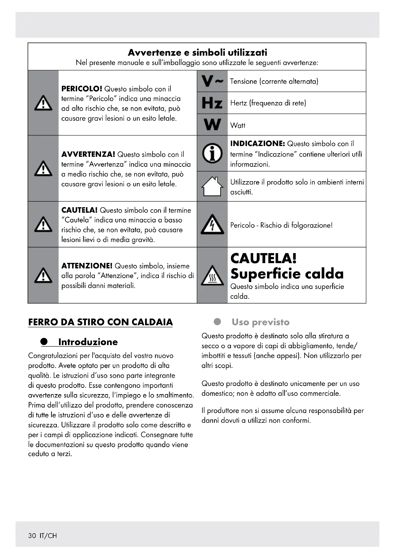 | Avvertenze e symboli utilizzati Nel presente manuale e sull'imballaggio sono utilizzate le seguenti avvertenze: | |||