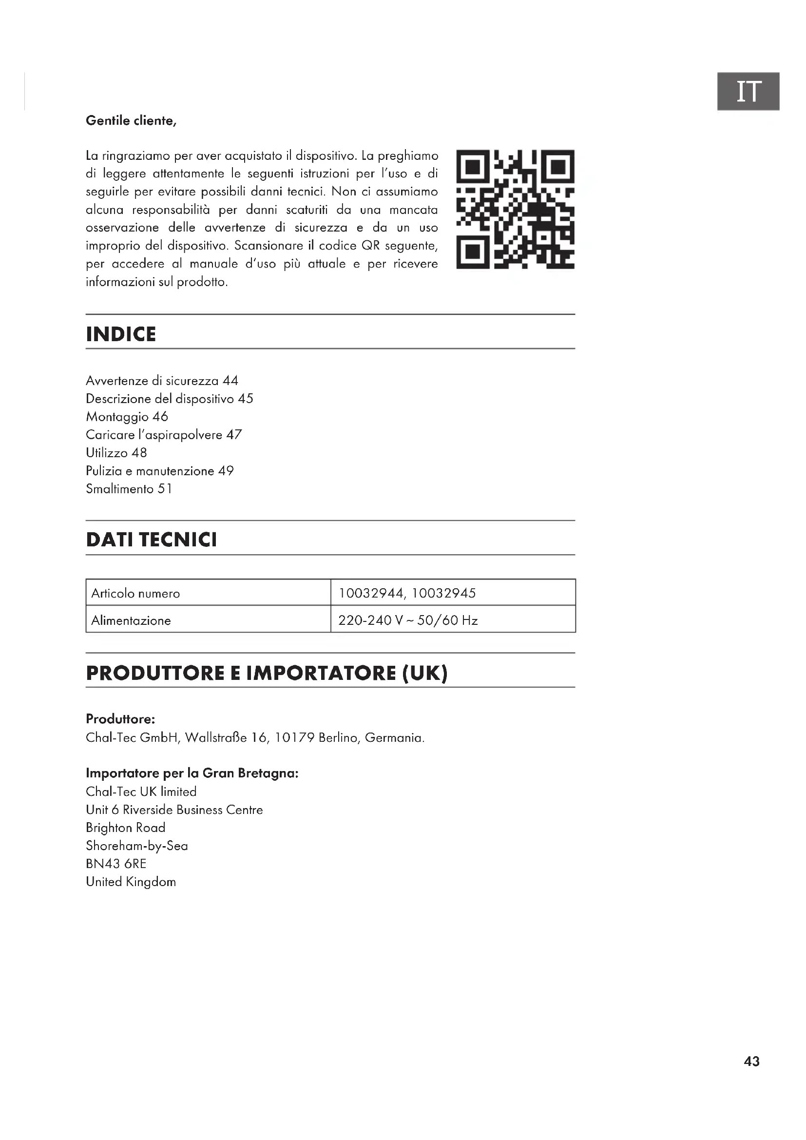 Gentile cliente, La ringraziamo per aver acquistato il dispositivo. La preghiamo di leggere attentamente le seguenti istruzioni per l’uso e di seguirle per evitare possibili danni tecnici. Non ci assumiamo alcuna responsabilità per danni scaturiti da una mancata osservazione delle avvertenze di sicurezza e da un uso improprio del dispositivo. Scansionare il codice QR seguente, per accedere al manuale d’uso più attuale e per ricevere informazioni sul prodotto. INDICE Avvertenze di sicurezza44 Descrizione del dispositivo45 Montaggio46 Caricare l’aspirapolvere47 Utilizzo48 Pulizia e manutenzione49 Smaltimento51 DATI TECNICI Articolo numero 10032944, 10032945 Alimentazione 220-240 V ~ 50/60 Hz PRODUTTORE E IMPORTATORE (UK) Produttore: Chal-Tec GmbH, Wallstraße 16, 10179 Berlino, Germania. Importatore per la Gran Bretagna: Chal-Tec UK limited Unit 6 Riverside Business Centre Brighton Road Shoreham-by-Sea BN43 6RE United Kingdom44