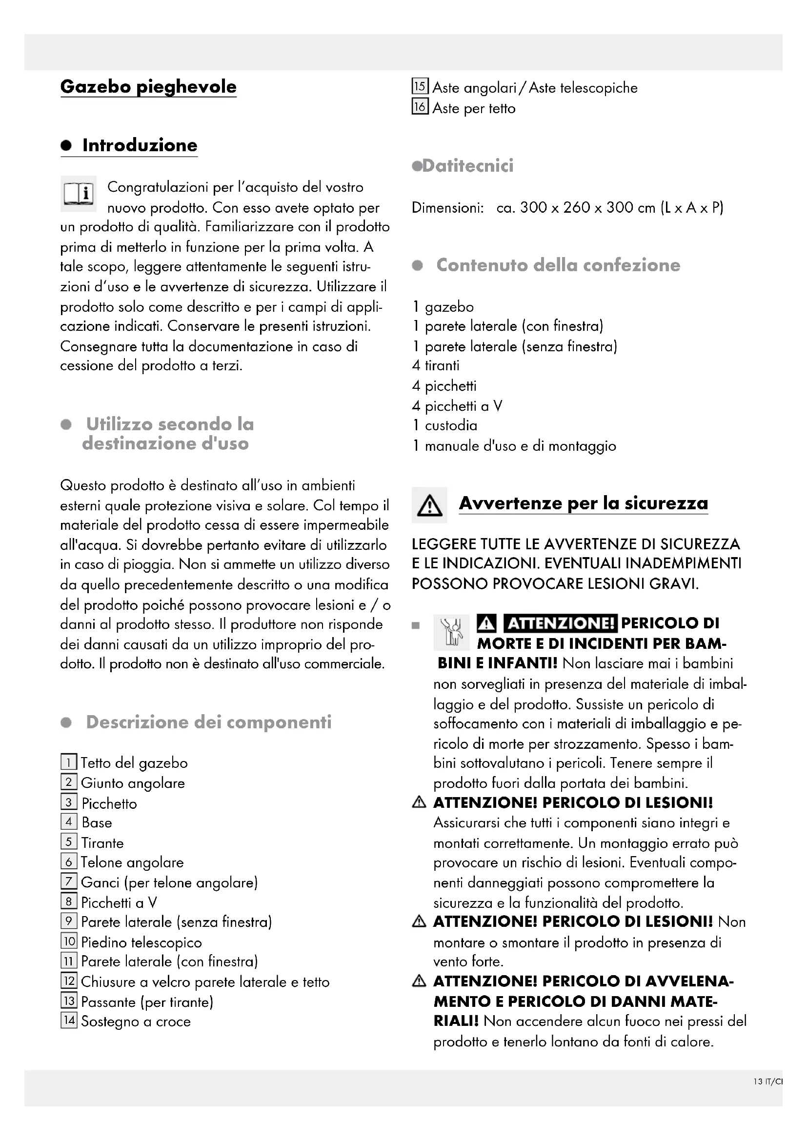 Aste per tetto Dati tecnici Dimensioni: ca. 300 x 260 x 300 cm (L x A x P) Contenuto della confezione 1 gazebo 1 parete laterale (con finestra) 1 parete laterale (senza finestra) 4 tiranti 4 picchetti 4 picchetti a V 1 custodia 1 manuale d'uso e di montaggio Avvertenze per la sicurezza
