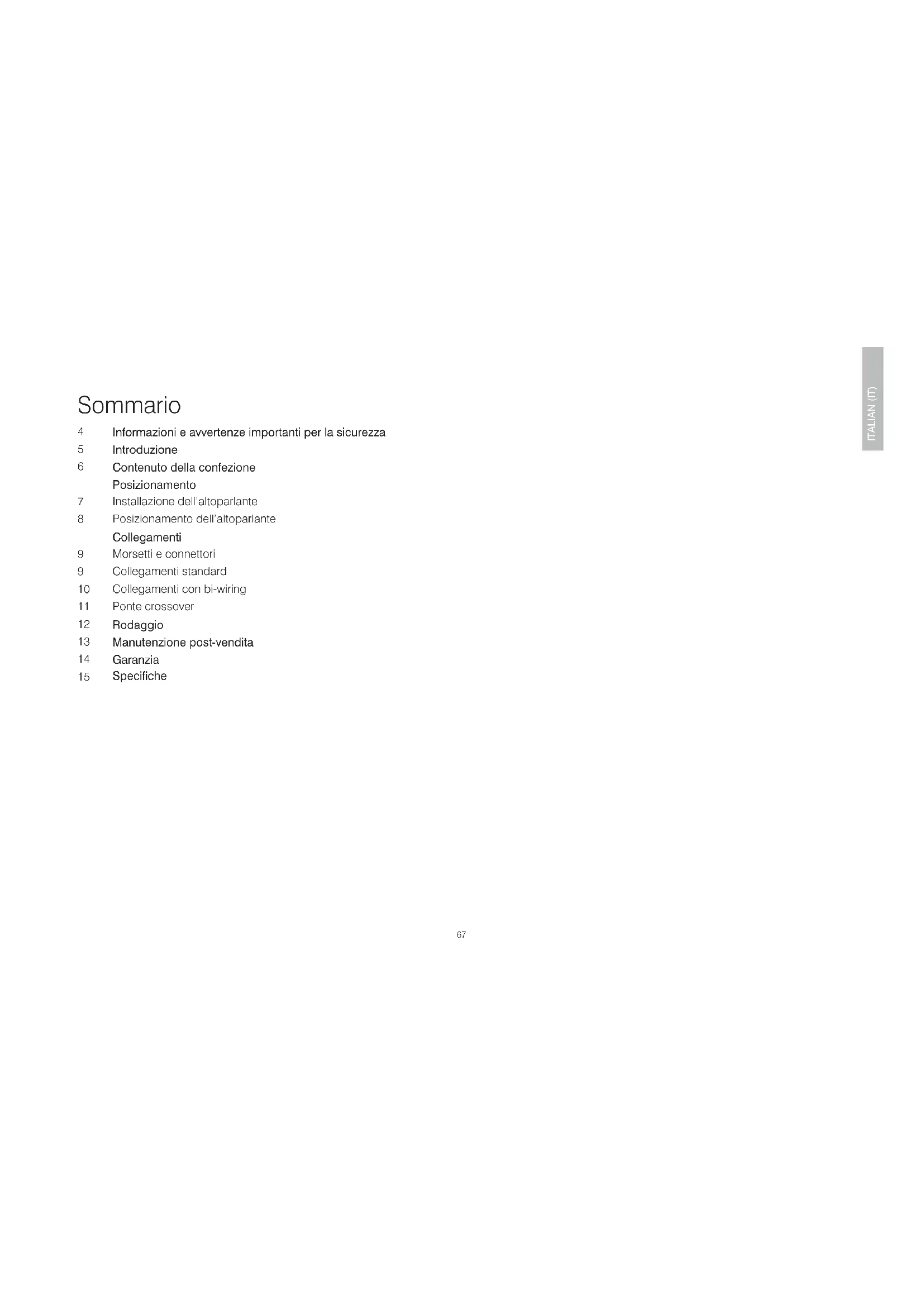 SWEDISHSV 16167 ITALIAN (IT) Informazioni e avvertenze importanti per la sicurezza Introduzione Contenuto della confezione Posizionamento Installazione dell’altoparlante Posizionamento dell’altoparlante Collegamenti Morsetti e connettori Collegamenti standard Collegamenti con bi-wiring Ponte crossover Rodaggio Manutenzione post-vendita Garanzia Speciche Sommario