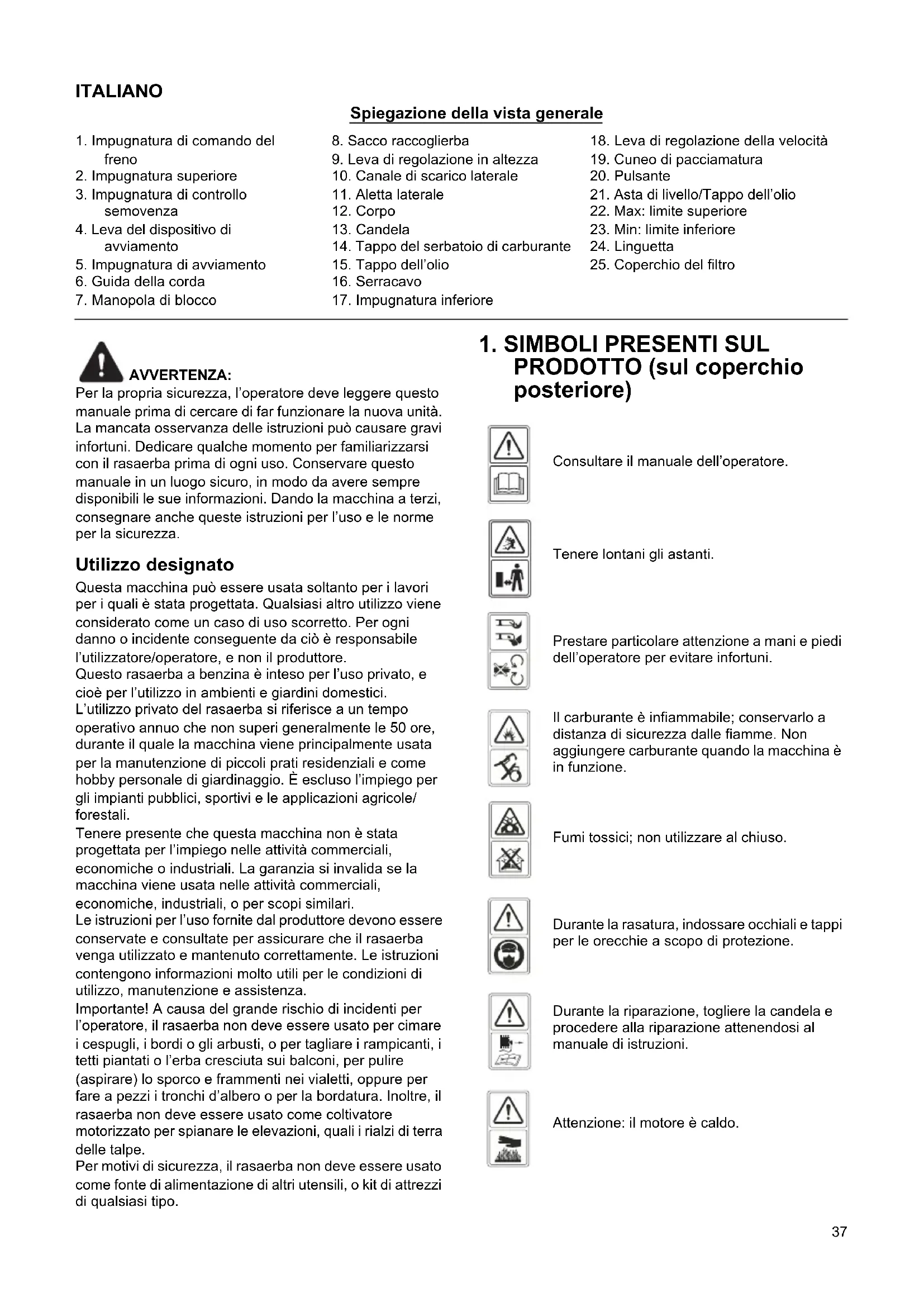 Nur für europäische Länder Die EG-Konformitätserklärung ist als Anhang A in dieser Bedienungsanleitung enthalten.37 ITALIANO Spiegazione della vista generale AVVERTENZA: Per la propria sicurezza, l’operatore deve leggere questo manuale prima di cercare di far funzionare la nuova unità. La mancata osservanza delle istruzioni può causare gravi infortuni. Dedicare qualche momento per familiarizzarsi con il rasaerba prima di ogni uso. Conservare questo manuale in un luogo sicuro, in modo da avere sempre disponibili le sue informazioni. Dando la macchina a terzi, consegnare anche queste istruzioni per l’uso e le norme per la sicurezza. Utilizzo designato Questa macchina può essere usata soltanto per i lavori per i quali è stata progettata. Qualsiasi altro utilizzo viene considerato come un caso di uso scorretto. Per ogni danno o incidente conseguente da ciò è responsabile l’utilizzatore/operatore, e non il produttore. Questo rasaerba a benzina è inteso per l’uso privato, e cioè per l’utilizzo in ambienti e giardini domestici. L’utilizzo privato del rasaerba si riferisce a un tempo operativo annuo che non superi generalmente le 50 ore, durante il quale la macchina viene principalmente usata per la manutenzione di piccoli prati residenziali e come hobby personale di giardinaggio. È escluso l’impiego per gli impianti pubblici, sportivi e le applicazioni agricole/ forestali. Tenere presente che questa macchina non è stata progettata per l’impiego nelle attività commerciali, economiche o industriali. La garanzia si invalida se la macchina viene usata nelle attività commerciali, economiche, industriali, o per scopi similari. Le istruzioni per l’uso fornite dal produttore devono essere conservate e consultate per assicurare che il rasaerba venga utilizzato e mantenuto correttamente. Le istruzioni contengono informazioni molto utili per le condizioni di utilizzo, manutenzione e assistenza. Importante! A causa del grande rischio di incidenti per l’operatore, il rasaerba non deve essere usato per cimare i cespugli, i bordi o gli arbusti, o per tagliare i rampicanti, i tetti piantati o l’erba cresciuta sui balconi, per pulire (aspirare) lo sporco e frammenti nei vialetti, oppure per fare a pezzi i tronchi d’albero o per la bordatura. Inoltre, il rasaerba non deve essere usato come coltivatore motorizzato per spianare le elevazioni, quali i rialzi di terra delle talpe. Per motivi di sicurezza, il rasaerba non deve essere usato come fonte di alimentazione di altri utensili, o kit di attrezzi di qualsiasi tipo.