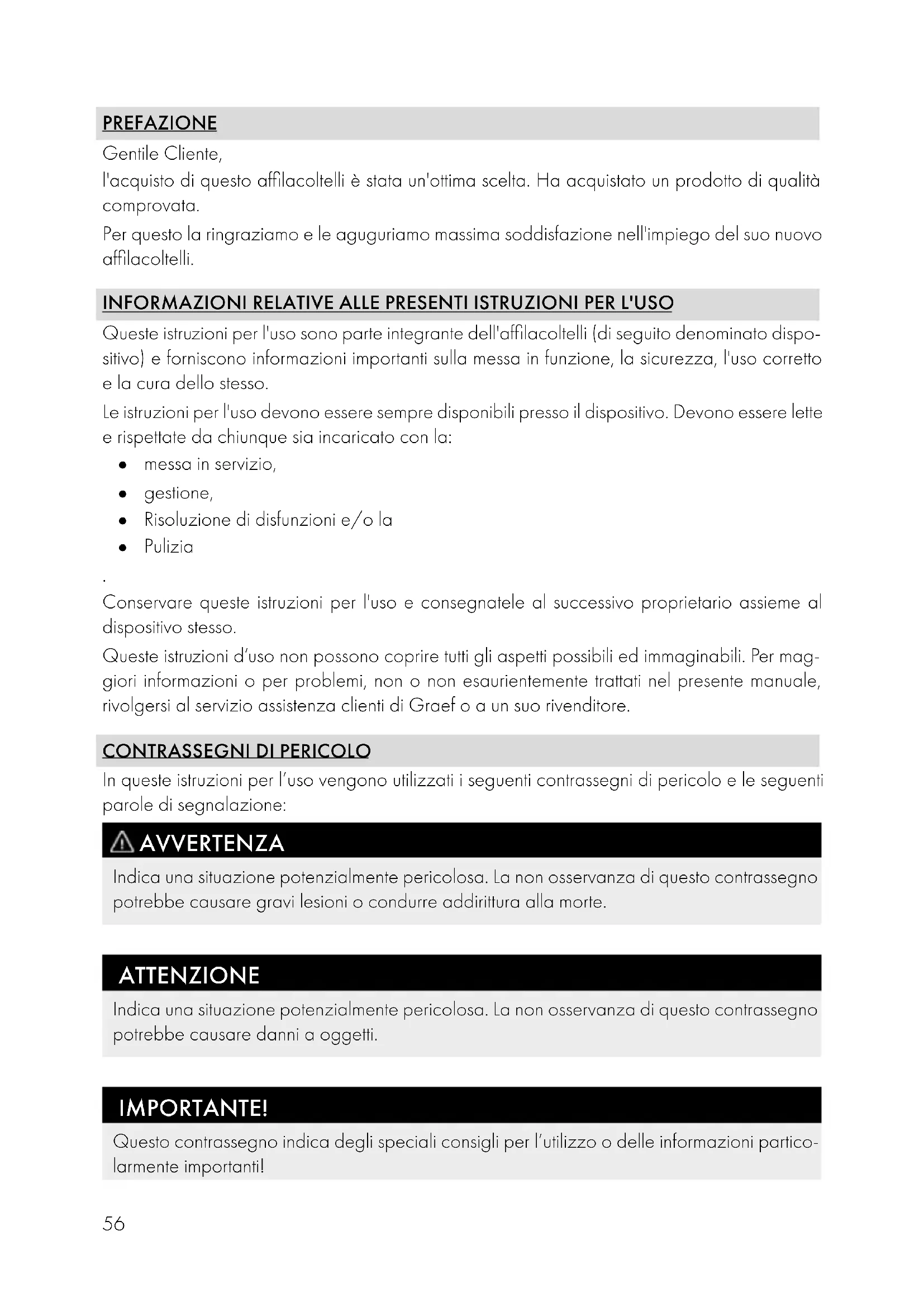 Conservare queste istruzioni per l'uso e consegnatele al successivo proprietario assieme al dispositivo stesso. Queste istruzioni d’uso non possono coprire tutti gli aspetti possibili ed immaginabili. Per mag- giori informazioni o per problemi, non o non esaurientemente trattati nel presente manuale, rivolgersi al servizio assistenza clienti di Graef o a un suo rivenditore.