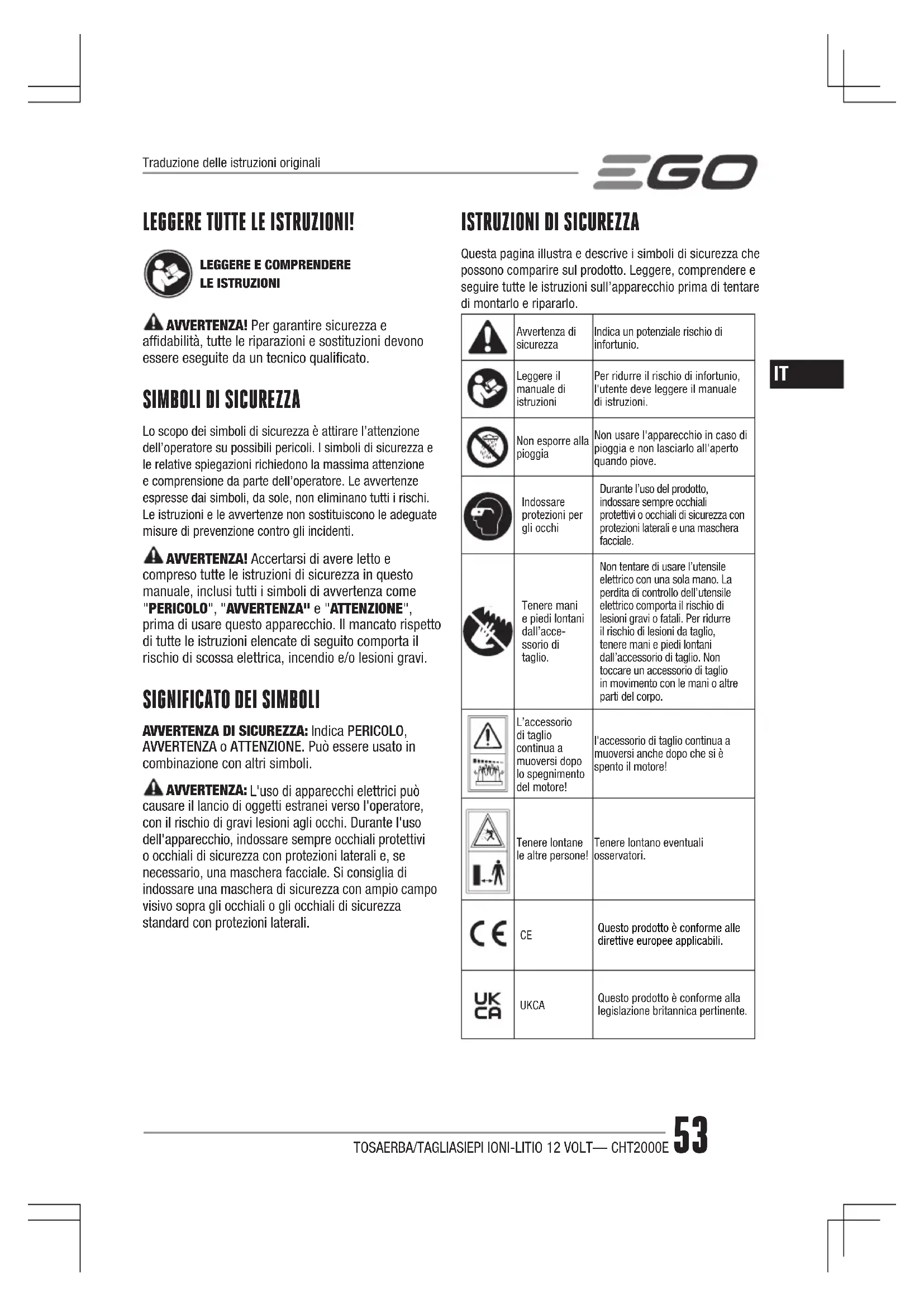 Questa pagina illustra e descrive i simboli di sicurezza che possono comparire sul prodotto. Leggere, comprendere e seguire tutte le istruzioni sull’apparecchio prima di tentare di montarlo e ripararlo. Avvertenza di sicurezzaIndica un potenziale rischio di infortunio.Leggere il manuale di istruzioniPer ridurre il rischio di infortunio, l'utente deve leggere il manuale di istruzioni.Non esporre alla pioggiaNon usare l'apparecchio in caso di pioggia e non lasciarlo all'aperto quando piove.Indossare protezioni per gli occhiDurante l’uso del prodotto, indossare sempre occhiali protettivi o occhiali di sicurezza con protezioni laterali e una maschera facciale.Tenere mani e piedi lontani dall’acce-ssorio di taglio.Non tentare di usare l’utensile elettrico con una sola mano. La perdita di controllo dell’utensile elettrico comporta il rischio di lesioni gravi o fatali. Per ridurre il rischio di lesioni da taglio, tenere mani e piedi lontani dall’accessorio di taglio. Non toccare un accessorio di taglio in movimento con le mani o altre parti del corpo.L’accessorio di taglio continua a muoversi dopo lo spegnimento del motore!l'accessorio di taglio continua a muoversi anche dopo che si è spento il motore!Tenere lontane le altre persone!Tenere lontano eventuali osservatori. Questo prodotto è conforme alle direttive europee applicabili. UKCA Questo prodotto è conforme alla legislazione britannica pertinente. Traduzione delle istruzioni originaliTOSAERBA/TAGLIASIEPI IONI-LITIO 12 VOLT— CHT2000E54