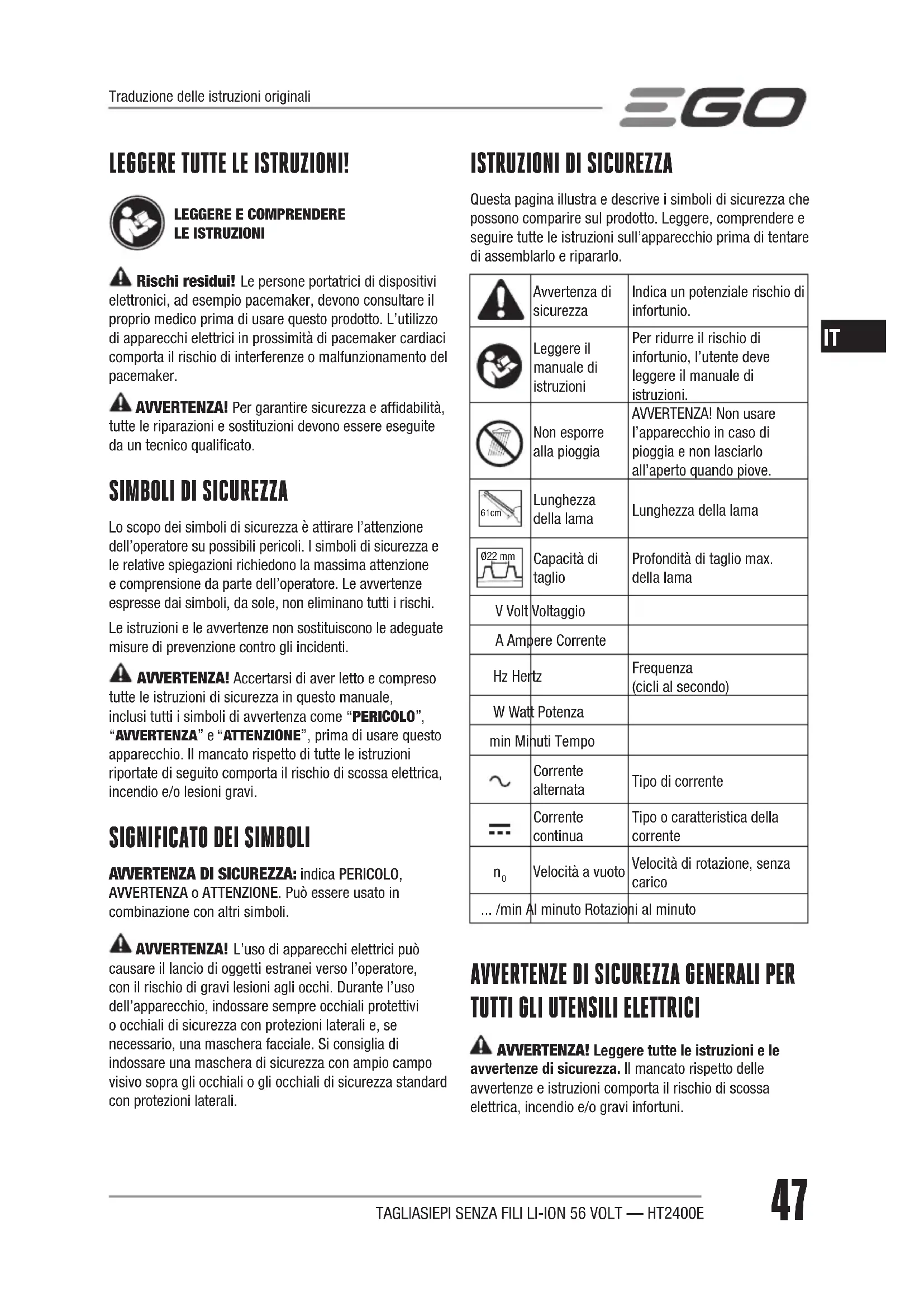 AVVERTENZA! Leggere tutte le istruzioni e le avvertenze di sicurezza. Il mancato rispetto delle avvertenze e istruzioni comporta il rischio di scossa elettrica, incendio e/o gravi infortuni.Traduzione delle istruzioni originaliTAGLIASIEPI SENZA FILI LI-ION 56 VOLT — HT2400E 48