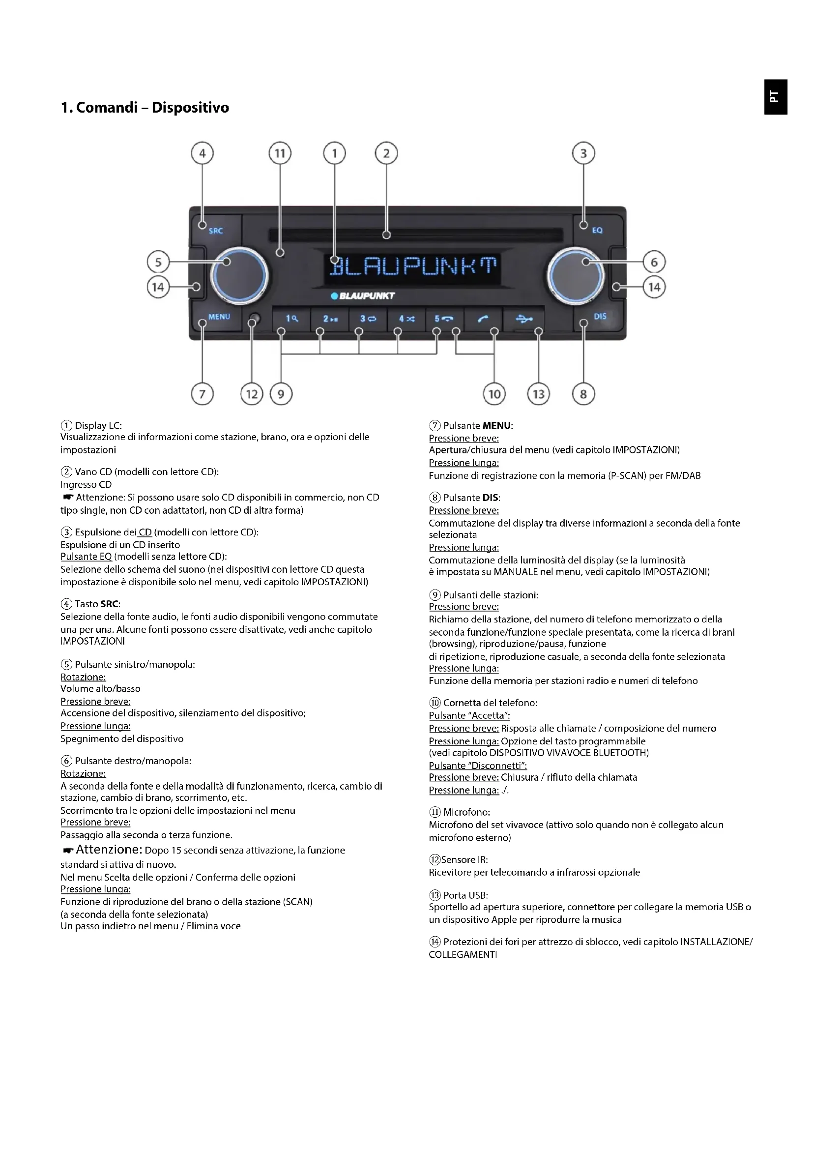 ① Display LC: Visualizzazione di informazioni come stazione, brano, ora e opzioni delle impostazioni ② Vano CD (modelli con lettore CD): Ingresso CD Attenzione: Si possono usare solo CD disponibili in commercio, non CD tipo single, non CD con adattatori, non CD di altra forma) ③ Espulsione dei CD (modelli con lettore CD): Espulsione di un CD inserito Pulsante EQ (modelli senza lettore CD): Selezione dello schema del suono (nei dispositivi con lettore CD questa impostazione è disponibile solo nel menu, vedi capitolo IMPOSTAZIONI) ④ Tasto SRC: Selezione della fonte audio, le fonti audio disponibili vengono commutate una per una. Alcune fonti possono essere disattivate, vedi anche capitolo IMPOSTAZIONI ⑤ Pulsante sinistro/manopola: Rotazione: Volume alto/basso Pressione breve: Accensione del dispositivo, silenziamento del dispositivo; Pressione lunga: Spegnimento del dispositivo ⑥ Pulsante destro/manopola: Rotazione: A seconda della fonte e della modalità di funzionamento, ricerca, cambio di stazione, cambio di brano, scorrimento, etc. Scorrimento tra le opzioni delle impostazioni nel menu Pressione breve: Passaggio alla seconda o terza funzione. Attenzione: Dopo 15 secondi senza attivazione, la funzione standard si attiva di nuovo. Nel menu Scelta delle opzioni / Conferma delle opzioni Pressione lunga: Funzione di riproduzione del brano o della stazione (SCAN) (a seconda della fonte selezionata) Un passo indietro nel menu / Elimina voce ⑦ Pulsante MENU: Pressione breve: Apertura/chiusura del menu (vedi capitolo IMPOSTAZIONI) Pressione lunga: Funzione di registrazione con la memoria (P-SCAN) per FM/DAB ⑧ Pulsante DIS: Pressione breve: Commutazione del display tra diverse informazioni a seconda della fonte selezionata Pressione lunga: Commutazione della luminosità del display (se la luminosità è impostata su MANUALE nel menu, vedi capitolo IMPOSTAZIONI) ⑨ Pulsanti delle stazioni: Pressione breve: Richiamo della stazione, del numero di telefono memorizzato o della seconda funzione/funzione speciale presentata, come la ricerca di brani (browsing), riproduzione/pausa, funzione di ripetizione, riproduzione casuale, a seconda della fonte selezionata Pressione lunga: Funzione della memoria per stazioni radio e numeri di telefono ⑩ Cornetta del telefono: Pulsante “Accetta”: Pressione breve: Risposta alle chiamate / composizione del numero Pressione lunga: Opzione del tasto programmabile (vedi capitolo DISPOSITIVO VIVAVOCE BLUETOOTH) Pulsante “Disconnetti”: Pressione breve: Chiusura / rifiuto della chiamata Pressione lunga: ./. ⑪ Microfono: Microfono del set vivavoce (attivo solo quando non è collegato alcun microfono esterno) ⑫Sensore IR: Ricevitore per telecomando a infrarossi opzionale ⑬ Porta USB: Sportello ad apertura superiore, connettore per collegare la memoria USB o un dispositivo Apple per riprodurre la musica ⑭ Protezioni dei fori per attrezzo di sblocco, vedi capitolo INSTALLAZIONE/ COLLEGAMENTIIT