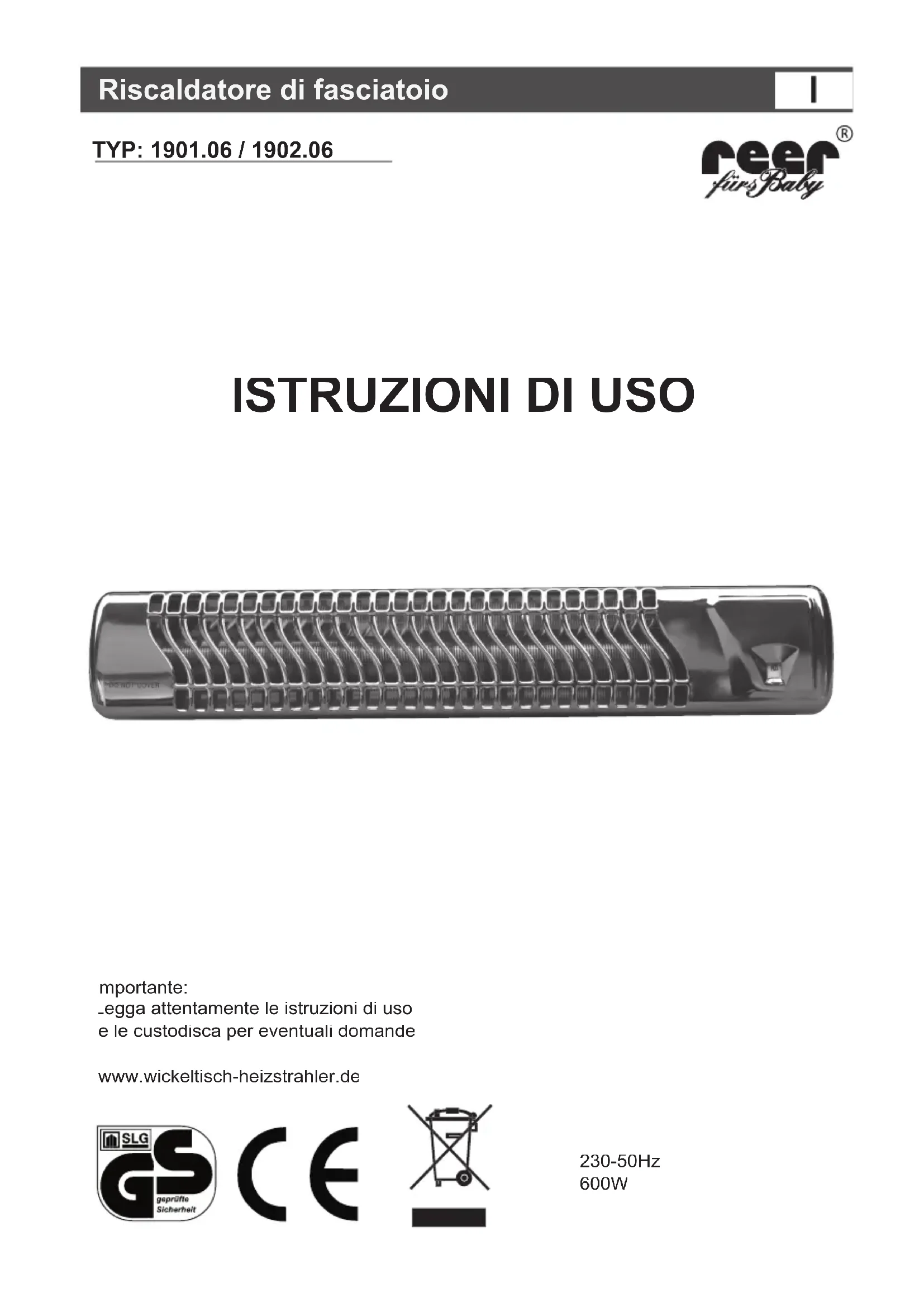250mmPULIZIONE: Prima di pulire l ápparecchio si assicuri che sia spento e freddo. Lo sconnetta. Pulisca la superfi cie con un panno secco o leggermente bagnato. Lasci la pulizione del refl ettore e del serpentino bollitore a un esperto della materia. RIPARAZIONI: Soltanto un tecnico deve fare riparazioni dell´apparecchio. DATI TECNICI: Voltagio: 230 V Potenza: 600 W Forma de montaggio: mendiante cavo o fi sso Categoria di sicurezza: 1 Angulo de radiazione: 90° 19Garantia Questo apparecchio è fatto di un material di prima classe e con molta accuratezza. Per questo la ditta Reer si sommette a una garantia di 3 anni a partire dalla data di compra per tutti i defetti di materiale e fabricazione. Nel caso di un defetto, p.f. riempia la carta di garantia e si diriga al negoziante. Non c´è garantia se: - l´appareccio non è stato utilizzato appropriatamente - il voltaggio era sbagliato - si sono fatti ingranamenti inautorizzati - la carta di garantia non è riempita di forma giusta. Non dimentichi lo scontrino! Reer GmbH, Riedwiesenstraße 7, 71229 Leonberg, German - - - - - - - - - - - - - - - - - - - - - - - - - - - - - - - - - - - - - - - - - - - - - - Typ: 1901.06 /
