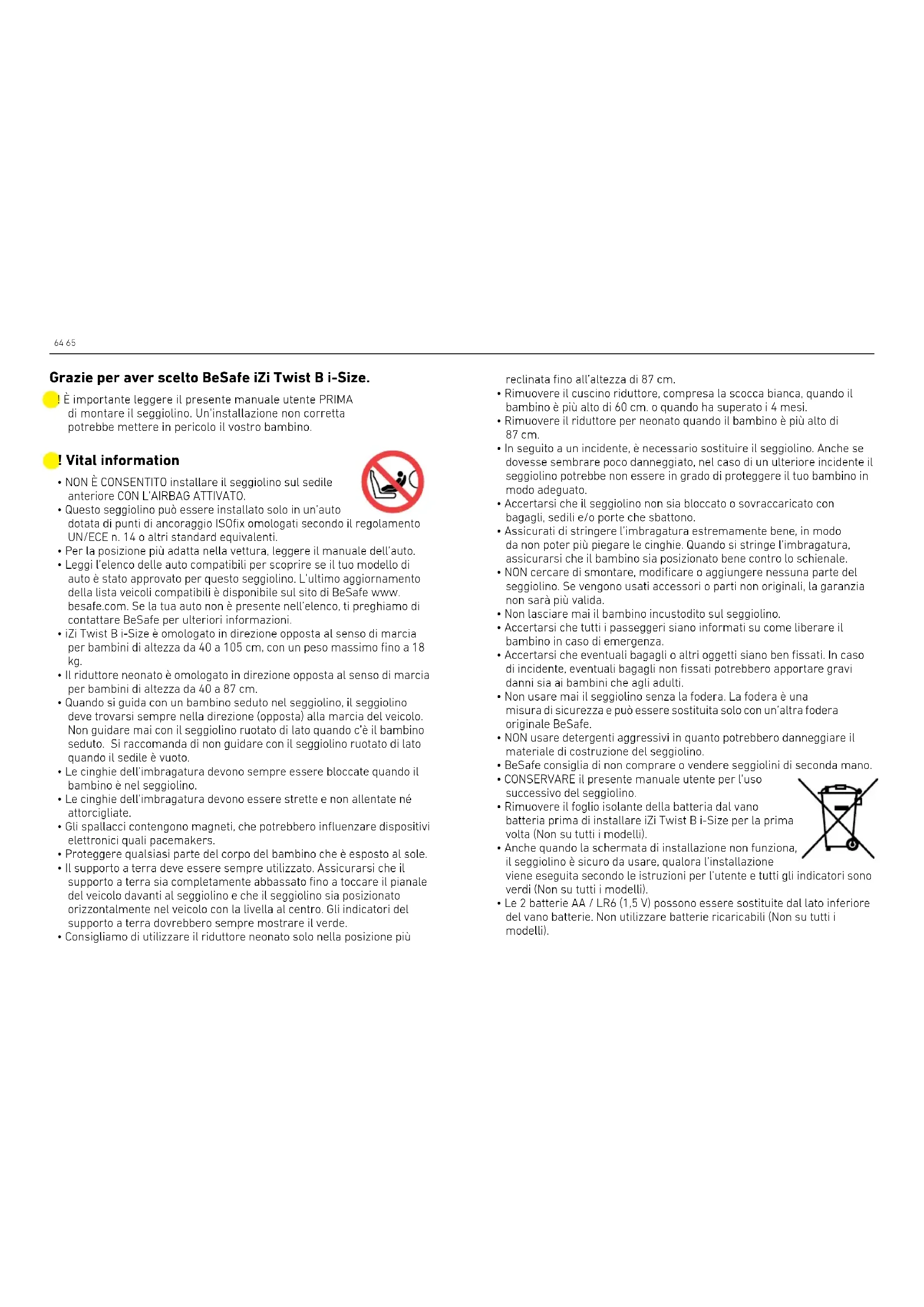 - Le 2 batterie AA / LR6 (1,5 V) possono essere sostituite dal lato inferiore del vano batterie. Non utilizzare batterie ricaricabili (Non su tutti i modelli). ! È importante leggere il presente manuale utente PRIMA di montare il seggiolino. Un’installazione non corretta potrebbe mettere in pericolo il vostro bambino. Grazie per aver scelto BeSafe iZi Twist B i-Size.66 67