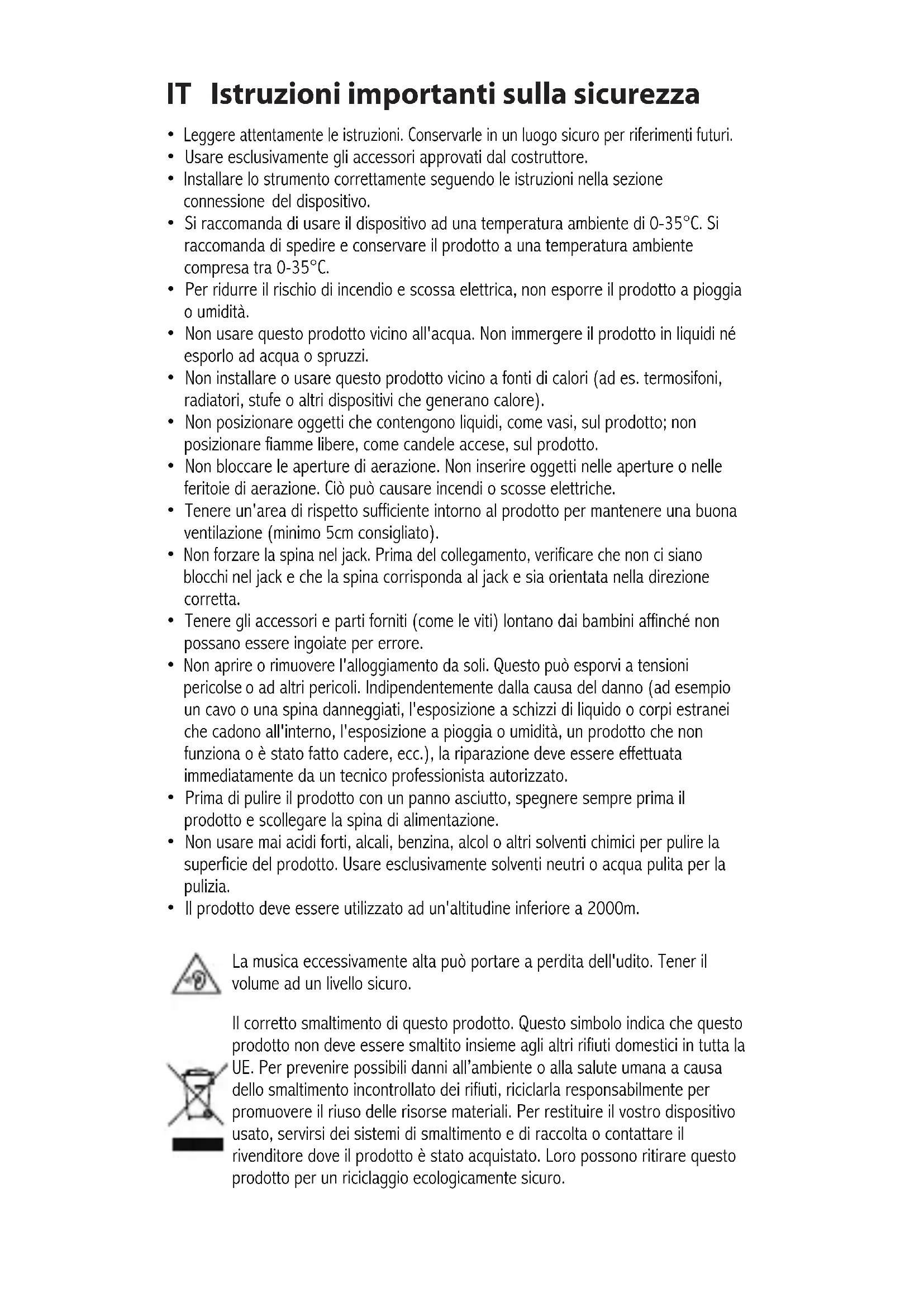 - Il prodotto deve essere utilizzato ad un'altitudine inferiore a 2000m. La musica eccessivamente alta può portare a perdita dell'udito. Tener il volume ad un livello sicuro. Il corretto smaltimento di questo prodotto. Questo simbolo indica che questo prodotto non deve essere smaltito insieme agli altri rifiuti domestici in tutta la UE. Per prevenire possibili danni all’ambiente o alla salute umana a causa dello smaltimento incontrollato dei rifiuti, riciclarla responsabilmente per promuovere il riuso delle risorse materiali. Per restituire il vostro dispositivo usato, servirsi dei sistemi di smaltimento e di raccolta o contattare il rivenditore dove il prodotto è stato acquistato. Loro possono ritirare questo prodotto per un riciclaggio ecologicamente sicuro.Prodotti wireless: