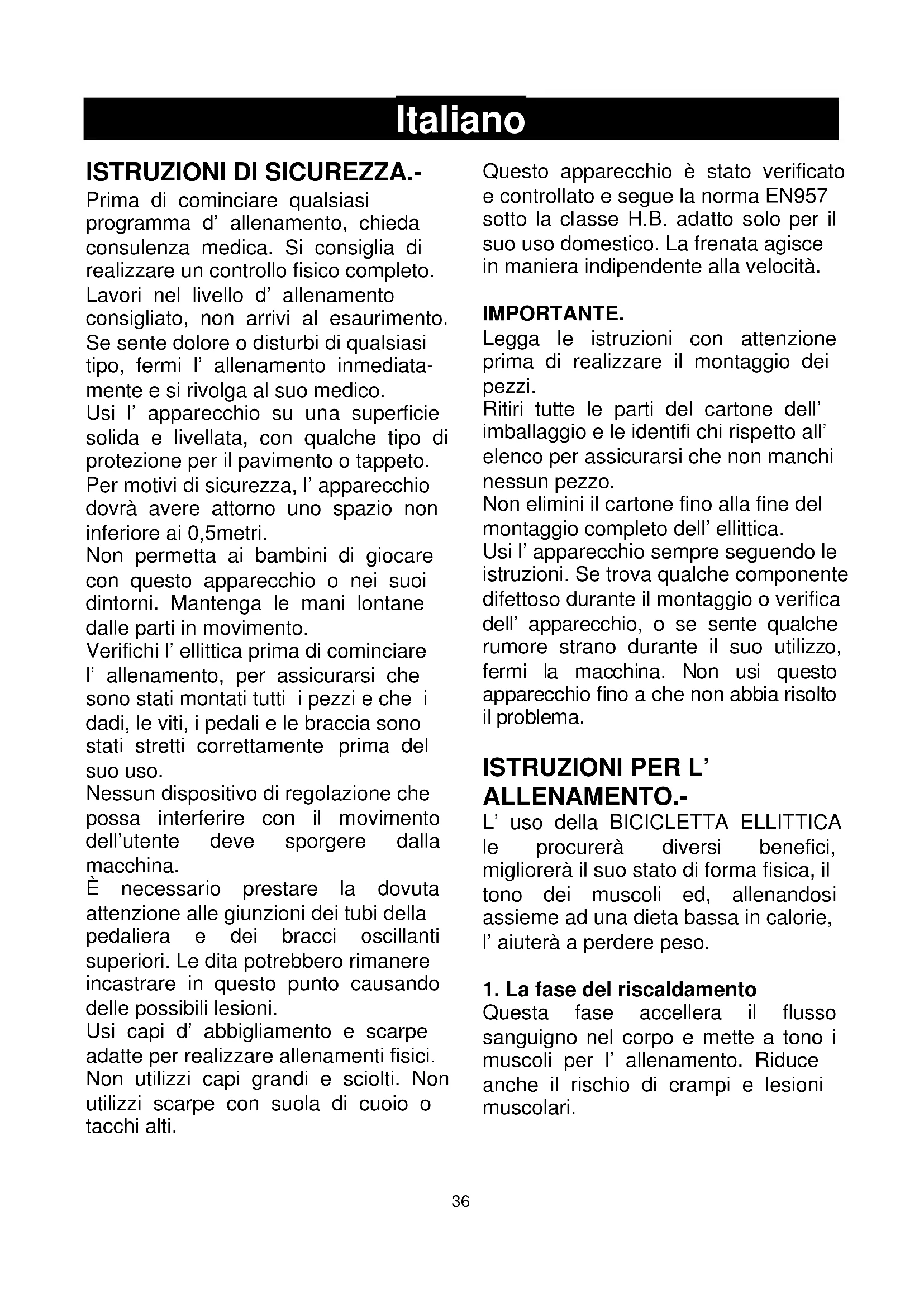 Prima di cominciare qualsiasi programma d’ allenamento, chieda consulenza medica. Si consiglia di realizzare un controllo fisico completo. Lavori nel livello d’ allenamento consigliato, non arrivi al esaurimento. Se sente dolore o disturbi di qualsiasi tipo, fermi l’ allenamento inmediata- mente e si rivolga al suo medico. Usi l’ apparecchio su una superficie solida e livellata, con qualche tipo di protezione per il pavimento o tappeto. Per motivi di sicurezza, l’ apparecchio dovrà avere attorno uno spazio non inferiore ai 0,5metri. Non permetta ai bambini di giocare con questo apparecchio o nei suoi dintorni. Mantenga le mani lontane dalle parti in movimento. Verifichi l’ ellittica prima di cominciare l’ allenamento, per assicurarsi che sono stati montati tutti i pezzi e che i dadi, le viti, i pedali e le braccia sono stati stretti correttamente prima del suo uso. Nessun dispositivo di regolazione che possa interferire con il movimento dell’utente deve sporgere dalla macchina. È necessario prestare la dovuta attenzione alle giunzioni dei tubi della pedaliera e dei bracci oscillanti superiori. Le dita potrebbero rimanere incastrare in questo punto causando delle possibili lesioni. Usi capi d’ abbigliamento e scarpe adatte per realizzare allenamenti fisici. Non utilizzi capi grandi e sciolti. Non utilizzi scarpe con suola di cuoio o tacchi alti. Questo apparecchio è stato verificato e controllato e segue la norma EN957 sotto la classe H.B. adatto solo per il suo uso domestico. La frenata agisce in maniera indipendente alla velocità. IMPORTANTE. Legga le istruzioni con attenzione prima di realizzare il montaggio dei pezzi. Ritiri tutte le parti del cartone dell’ imballaggio e le identifi chi rispetto all’ elenco per assicurarsi che non manchi nessun pezzo. Non elimini il cartone fino alla fine del montaggio completo dell’ ellittica. Usi l’ apparecchio sempre seguendo le istruzioni. Se trova qualche componente difettoso durante il montaggio o verifica dell’ apparecchio, o se sente qualche rumore strano durante il suo utilizzo, fermi la macchina. Non usi questo apparecchio fino a che non abbia risolto il problema.