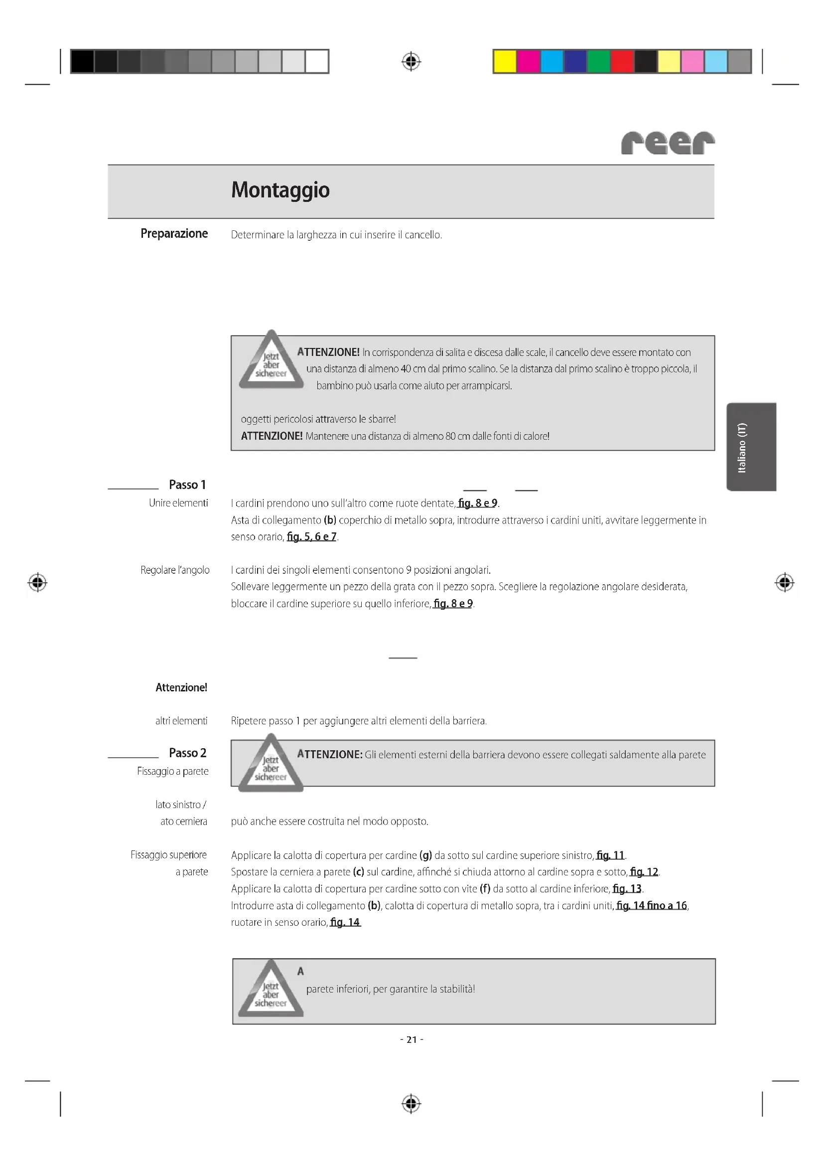 ATTENZIONE! In corrispondenza di salita e discesa dalle scale, il cancello deve essere montato con una distanza di almeno 40 cm dal primo scalino. Se la distanza dal primo scalino è troppo piccola, il bambino può usarla come aiuto per arrampicarsi. ATTENZIONE! oggetti pericolosi attraverso le sbarre! ATTENZIONE! Mantenere una distanza di almeno 80 cm dalle fonti di calore! Inserire elemento porta (a) + prolungamento (l) o (n), fig. 1fig. 4. I cardini prendono uno sull‘altro come ruote dentate, fig. 8 e 9. Asta di collegamento (b) coperchio di metallo sopra, introdurre attraverso i cardini uniti, avvitare leggermente in senso orario, fig. 5, 6 e 7. I cardini dei singoli elementi consentono 9 posizioni angolari. Sollevare leggermente un pezzo della grata con il pezzo sopra. Scegliere la regolazione angolare desiderata, bloccare il cardine superiore su quello inferiore, fig. 8 e 9.