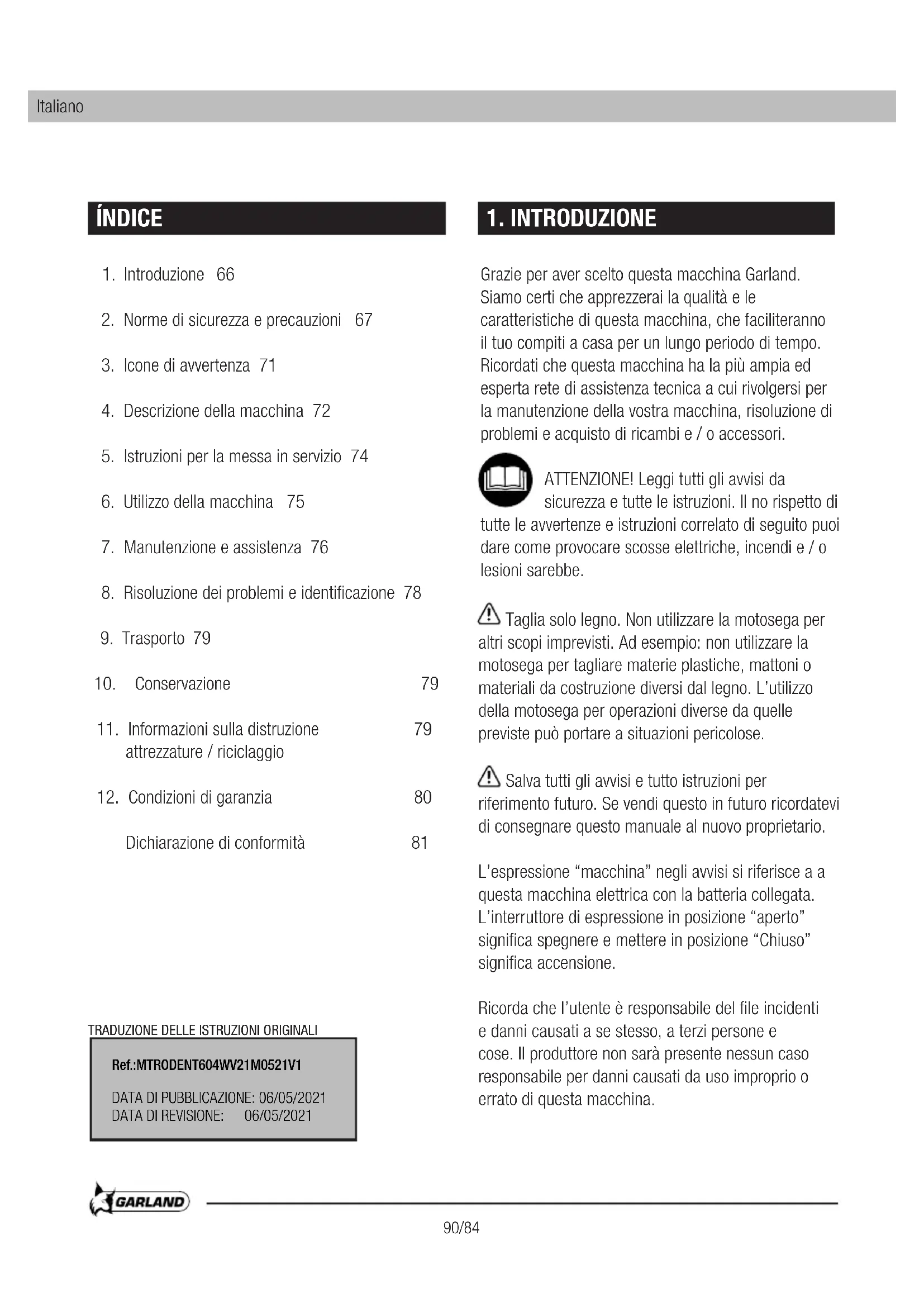 Grazie per aver scelto questa macchina Garland. Siamo certi che apprezzerai la qualità e le caratteristiche di questa macchina, che faciliteranno il tuo compiti a casa per un lungo periodo di tempo. Ricordati che questa macchina ha la più ampia ed esperta rete di assistenza tecnica a cui rivolgersi per la manutenzione della vostra macchina, risoluzione di problemi e acquisto di ricambi e / o accessori. ATTENZIONE! Leggi tutti gli avvisi da sicurezza e tutte le istruzioni. Il no rispetto di tutte le avvertenze e istruzioni correlato di seguito puoi dare come provocare scosse elettriche, incendi e / o lesioni sarebbe. Taglia solo legno. Non utilizzare la motosega per altri scopi imprevisti. Ad esempio: non utilizzare la motosega per tagliare materie plastiche, mattoni o materiali da costruzione diversi dal legno. L’utilizzo della motosega per operazioni diverse da quelle previste può portare a situazioni pericolose. Salva tutti gli avvisi e tutto istruzioni per riferimento futuro. Se vendi questo in futuro ricordatevi di consegnare questo manuale al nuovo proprietario. L’espressione “macchina” negli avvisi si riferisce a a questa macchina elettrica con la batteria collegata. L’interruttore di espressione in posizione “aperto” significa spegnere e mettere in posizione “Chiuso” significa accensione. Ricorda che l’utente è responsabile del file incidenti e danni causati a se stesso, a terzi persone e cose. Il produttore non sarà presente nessun caso responsabile per danni causati da uso improprio o errato di questa macchina. Ref.:MTRODENT604WV21M0521V1