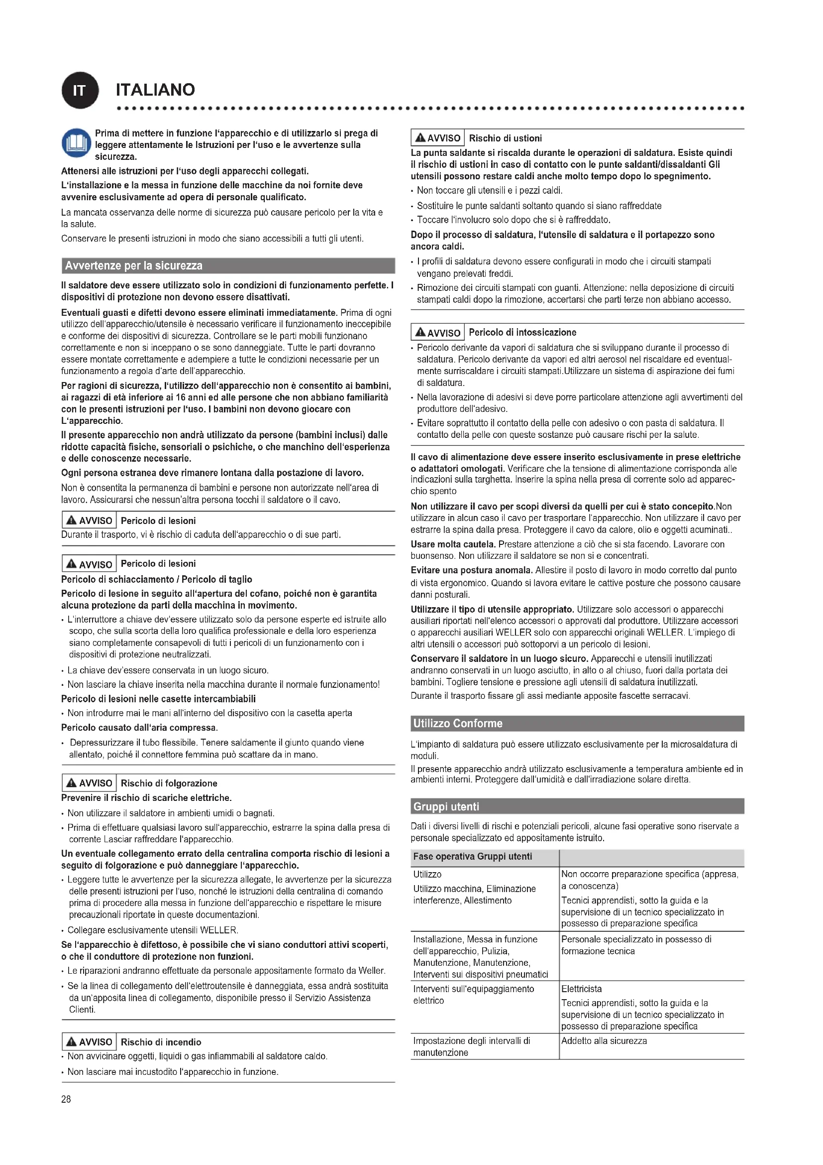 - Evitare soprattutto il contatto della pelle con adesivo o con pasta di saldatura. Il contatto della pelle con queste sostanze può causare rischi per la salute. Il cavo di alimentazione deve essere inserito esclusivamente in prese elettriche o adattatori omologati. Vericare che la tensione di alimentazione corrisponda alle indicazioni sulla targhetta. Inserire la spina nella presa di corrente solo ad apparec- chio spento Non utilizzare il cavo per scopi diversi da quelli per cui è stato concepito.Non utilizzare in alcun caso il cavo per trasportare l‘apparecchio. Non utilizzare il cavo per estrarre la spina dalla presa. Proteggere il cavo da calore, olio e oggetti acuminati.. Usare molta cautela. Prestare attenzione a ciò che si sta facendo. Lavorare con buonsenso. Non utilizzare il saldatore se non si e concentrati. Evitare una postura anomala. Allestire il posto di lavoro in modo corretto dal punto di vista ergonomico. Quando si lavora evitare le cattive posture che possono causare danni posturali. Utilizzare il tipo di utensile appropriato. Utilizzare solo accessori o apparecchi ausiliari riportati nell‘elenco accessori o approvati dal produttore. Utilizzare accessori o apparecchi ausiliari WELLER solo con apparecchi originali WELLER. L‘impiego di altri utensili o accessori può sottoporvi a un pericolo di lesioni. Conservare il saldatore in un luogo sicuro. Apparecchi e utensili inutilizzati andranno conservati in un luogo asciutto, in alto o al chiuso, fuori dalla portata dei bambini. Togliere tensione e pressione agli utensili di saldatura inutilizzati. Duranteiltrasportossaregliassimedianteappositefascetteserracavi. Utilizzo Conforme L‘impianto di saldatura può essere utilizzato esclusivamente per la microsaldatura di moduli. Il presente apparecchio andrà utilizzato esclusivamente a temperatura ambiente ed in ambienti interni. Proteggere dall‘umidità e dall‘irradiazione solare diretta. Gruppi utenti Dati i diversi livelli di rischi e potenziali pericoli, alcune fasi operative sono riservate a personale specializzato ed appositamente istruito. Fase operativa Gruppi utenti Utilizzo Utilizzo macchina, Eliminazione interferenze, Allestimento Nonoccorrepreparazionespecica(appresa, a conoscenza) Tecnici apprendisti, sotto la guida e la supervisione di un tecnico specializzato in possessodipreparazionespecica Installazione, Messa in funzione dell‘apparecchio, Pulizia, Manutenzione, Manutenzione, Interventi sui dispositivi pneumatici Personale specializzato in possesso di formazione tecnica Interventi sull‘equipaggiamento elettrico Elettricista Tecnici apprendisti, sotto la guida e la supervisione di un tecnico specializzato in possessodipreparazionespecica Impostazione degli intervalli di manutenzione Addetto alla sicurezza