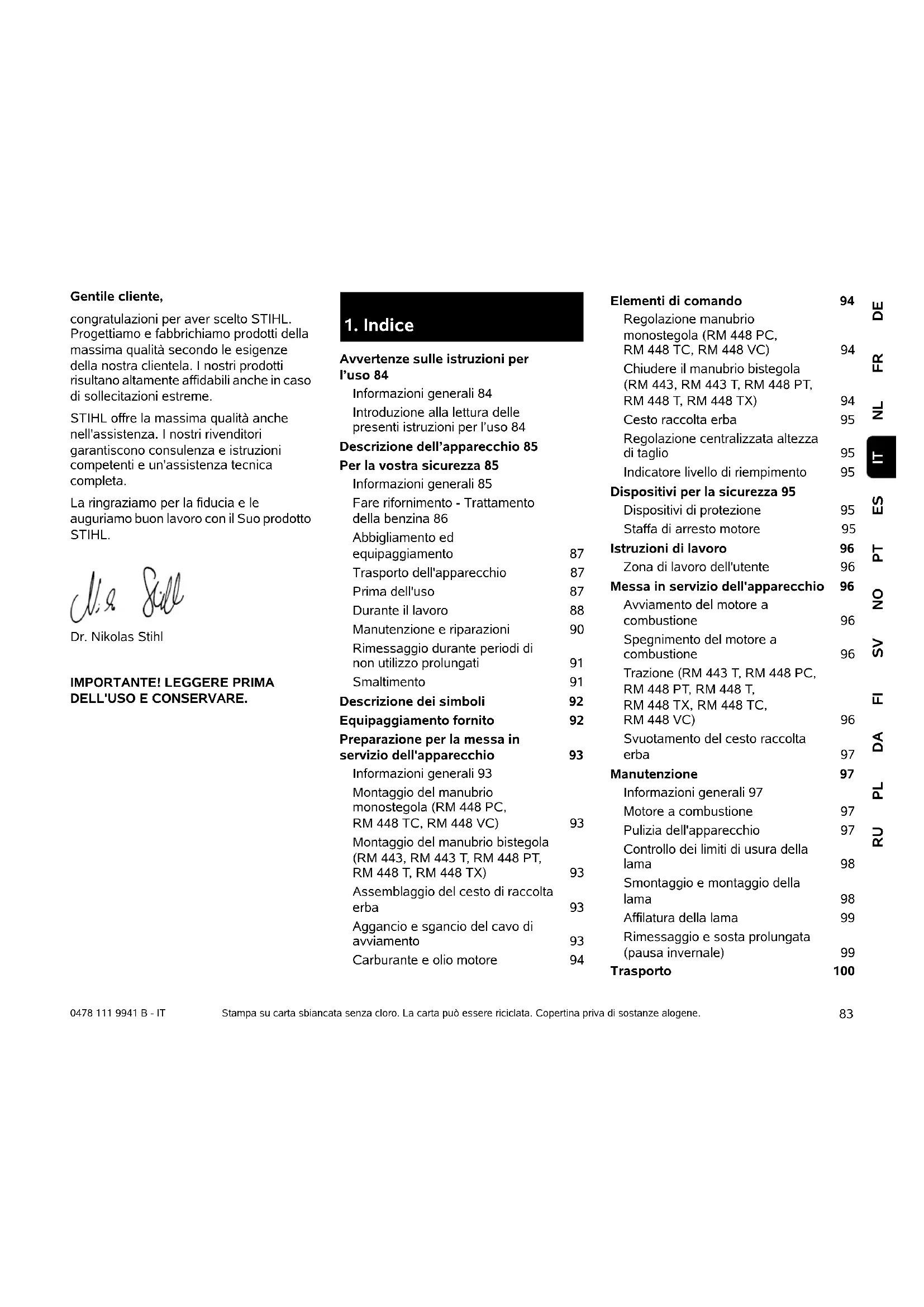 DEFRNLESPTNOSVFIDAPLRU IT 0478 111 9941 B - IT Gentile cliente, congratulazioni per aver scelto STIHL. Progettiamo e fabbrichiamo prodotti della massima qualità secondo le esigenze della nostra clientela. I nostri prodotti risultano altamente affidabili anche in caso di sollecitazioni estreme. STIHL offre la massima qualità anche nell'assistenza. I nostri rivenditori garantiscono consulenza e istruzioni competenti e un'assistenza tecnica completa. La ringraziamo per la fiducia e le auguriamo buon lavoro con il Suo prodotto STIHL. Dr. Nikolas Stihl