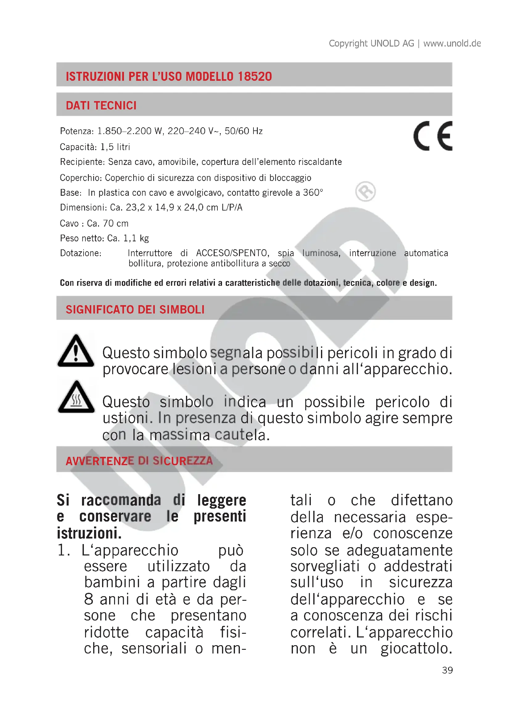 Questo simbolo segnala possibili pericoli in grado di provocare lesioni a persone o danni all‘apparecchio. Questo simbolo indica un possibile pericolo di ustioni. In presenza di questo simbolo agire sempre con la massima cautela. Potenza: 1.850–2.200 W, 220–240 V~, 50/60 Hz Capacità: 1,5 litri Recipiente: Senza cavo, amovibile, copertura dell’elemento riscaldante Coperchio: Coperchio di sicurezza con dispositivo di bloccaggio Base: In plastica con cavo e avvolgicavo, contatto girevole a 360° Dimensioni: Ca. 23,2 x 14,9 x 24,0 cm L/P/A Cavo : Ca. 70 cm Peso netto: Ca. 1,1 kg Dotazione: Interruttore di ACCESO/SPENTO, spia luminosa, interruzione automatica bollitura, protezione antibollitura a secco Con riserva di modifiche ed errori relativi a caratteristiche delle dotazioni, tecnica, colore e design.