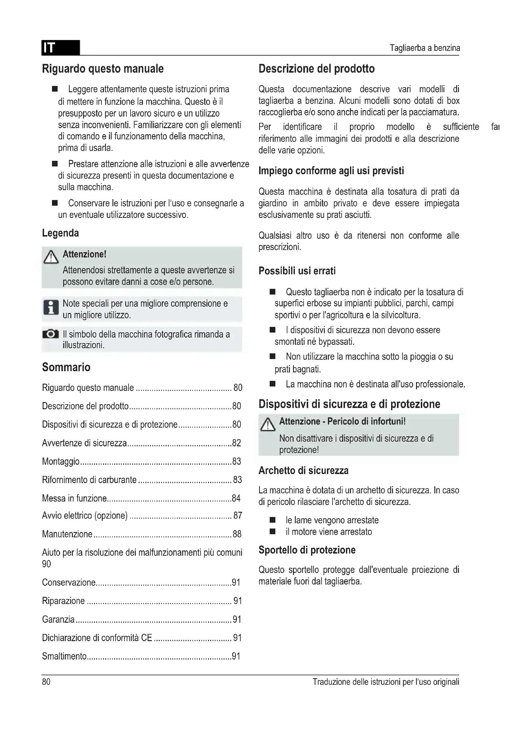 - Smaltimento Riguardo questo manuale Leggere attentamente queste istruzioni prima di mettere in funzione la macchina. Questo è il presupposto per un lavoro sicuro e un utilizzo senza inconvenienti. Familiarizzare con gli elementi di comando e il funzionamento della macchina, prima di usarla. Prestare attenzione alle istruzioni e alle avvertenze di sicurezza presenti in questa documentazione e sulla macchina. Conservare le istruzioni per l‘uso e consegnarle a un eventuale utilizzatore successivo. Legenda Attenzione! Attenendosi strettamente a queste avvertenze si possono evitare danni a cose e/o persone. Note speciali per una migliore comprensione e un migliore utilizzo. Ilsimbolodellamacchinafotogracarimandaa illustrazioni. Descrizione del prodotto Questa documentazione descrive vari modelli di tagliaerba a benzina. Alcuni modelli sono dotati di box raccoglierba e/o sono anche indicati per la pacciamatura. Per identicare il proprio modello è sufciente fare riferimento alle immagini dei prodotti e alla descrizione delle varie opzioni. Impiego conforme agli usi previsti Questa macchina è destinata alla tosatura di prati da giardino in ambito privato e deve essere impiegata esclusivamente su prati asciutti. Qualsiasi altro uso è da ritenersi non conforme alle prescrizioni. Possibili usi errati Questo tagliaerba non è indicato per la tosatura di supercierbosesuimpiantipubblici,parchi,campi sportivi o per l'agricoltura e la silvicoltura. I dispositivi di sicurezza non devono essere smontati né bypassati. Non utilizzare la macchina sotto la pioggia o su prati bagnati. La macchina non è destinata all'uso professionale. Dispositivi di sicurezza e di protezione Attenzione - Pericolo di infortuni! Non disattivare i dispositivi di sicurezza e di protezione! Archetto di sicurezza La macchina è dotata di un archetto di sicurezza. In caso di pericolo rilasciare l'archetto di sicurezza. le lame vengono arrestate il motore viene arrestato Sportello di protezione Questo sportello protegge dall'eventuale proiezione di materiale fuori dal tagliaerba.IT p. 91
