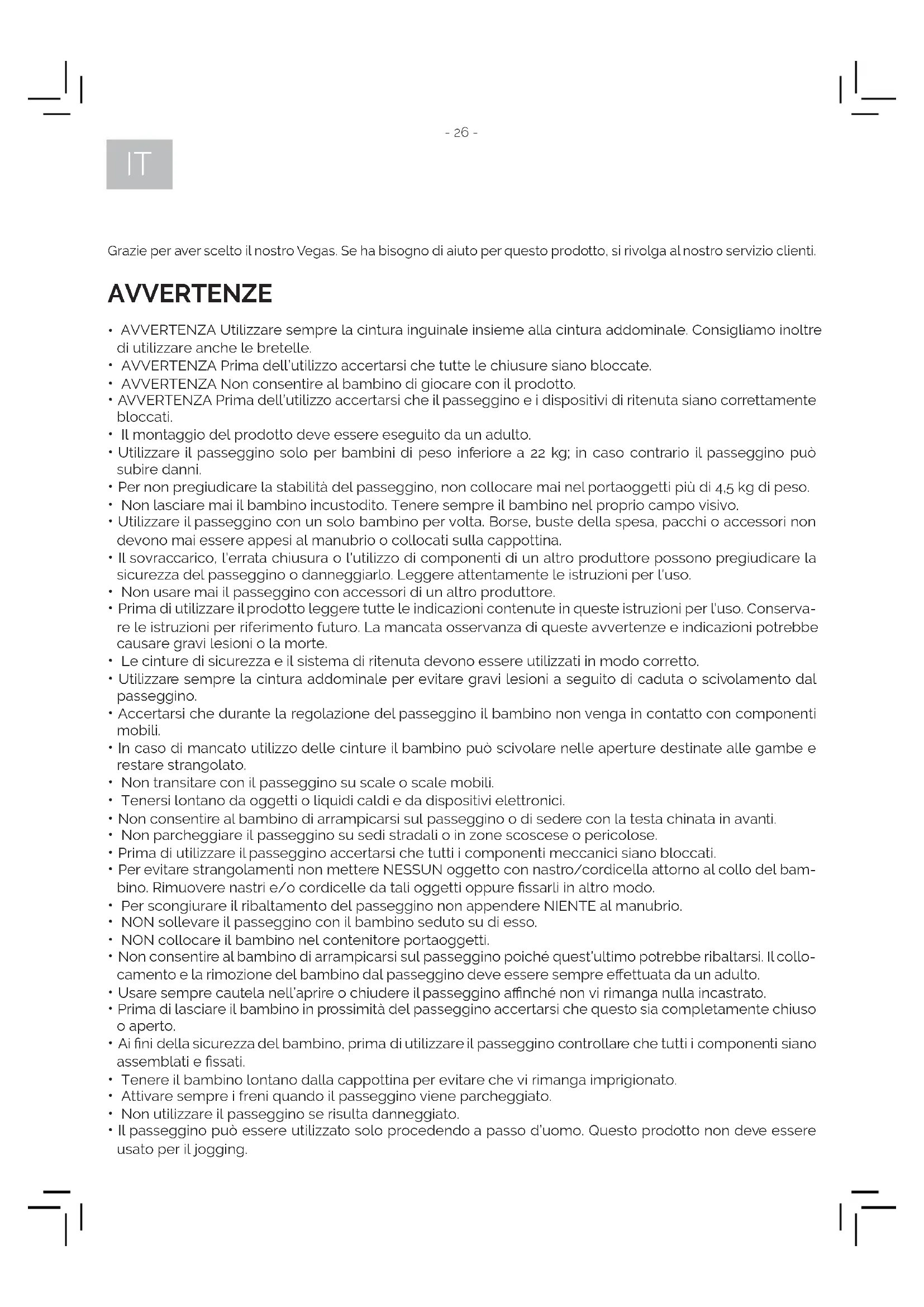 - Il passeggino può essere utilizzato solo procedendo a passo d’uomo. Questo prodotto non deve essere usato per il jogging. IT- 27 -