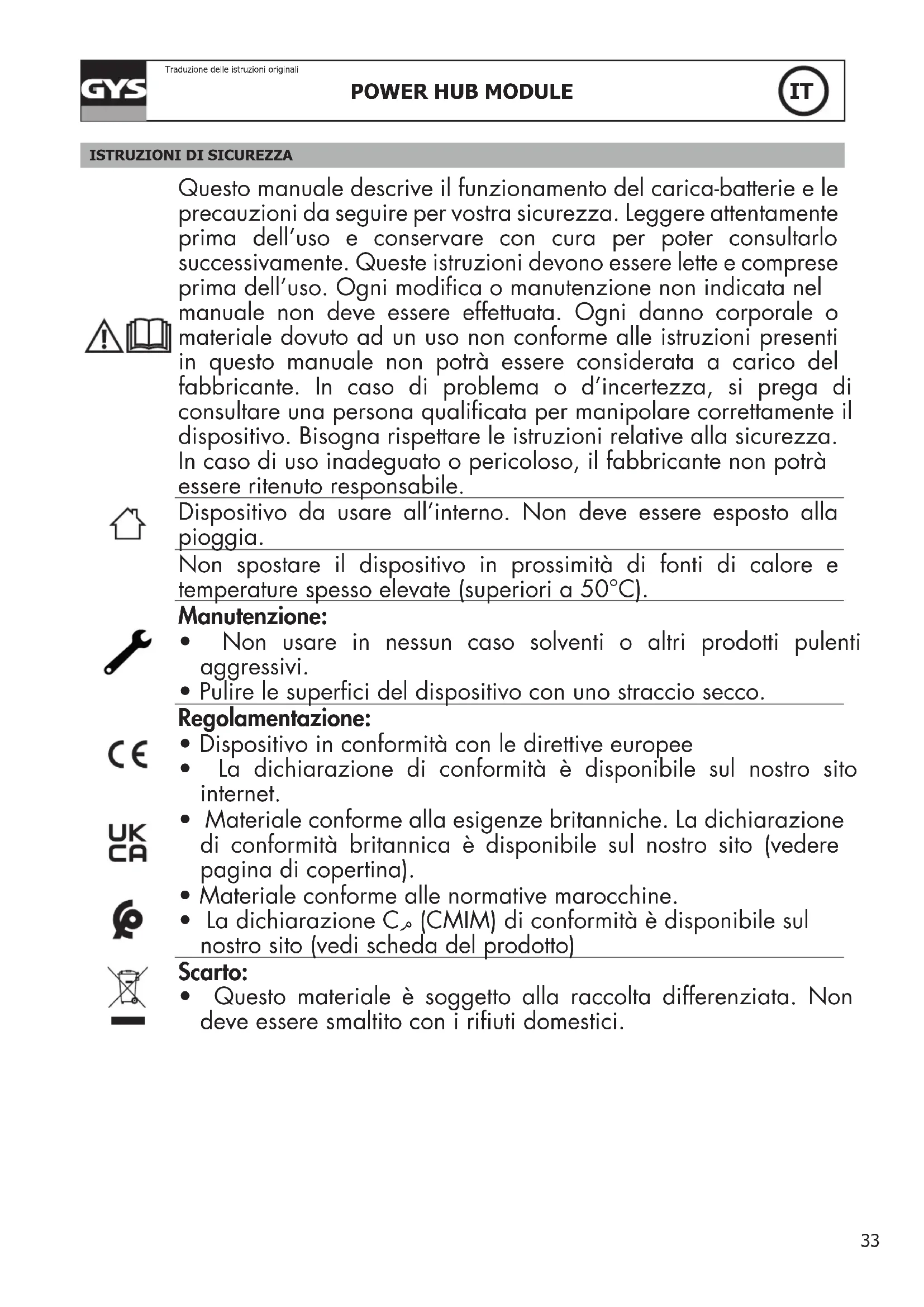 ITTraduzione delle istruzioni originaliDESCRIZIONE GENERALEIl Power Hub Module (PHM) è un accessorio che permette di accoppiare dei Gyash in parallelo (massimo 4) al ne di sommare le loro potenze per ricaricare una batteria di grossa capacità. I Gysash raccordati devono obbligatoriamente essere identici. Il PHM deve obbligatoriamente essere associato a uno Smart Hub Module SHM (rif. 025981) che stabi- lisce la comunicazione tra tutti i Gysash raccordati.