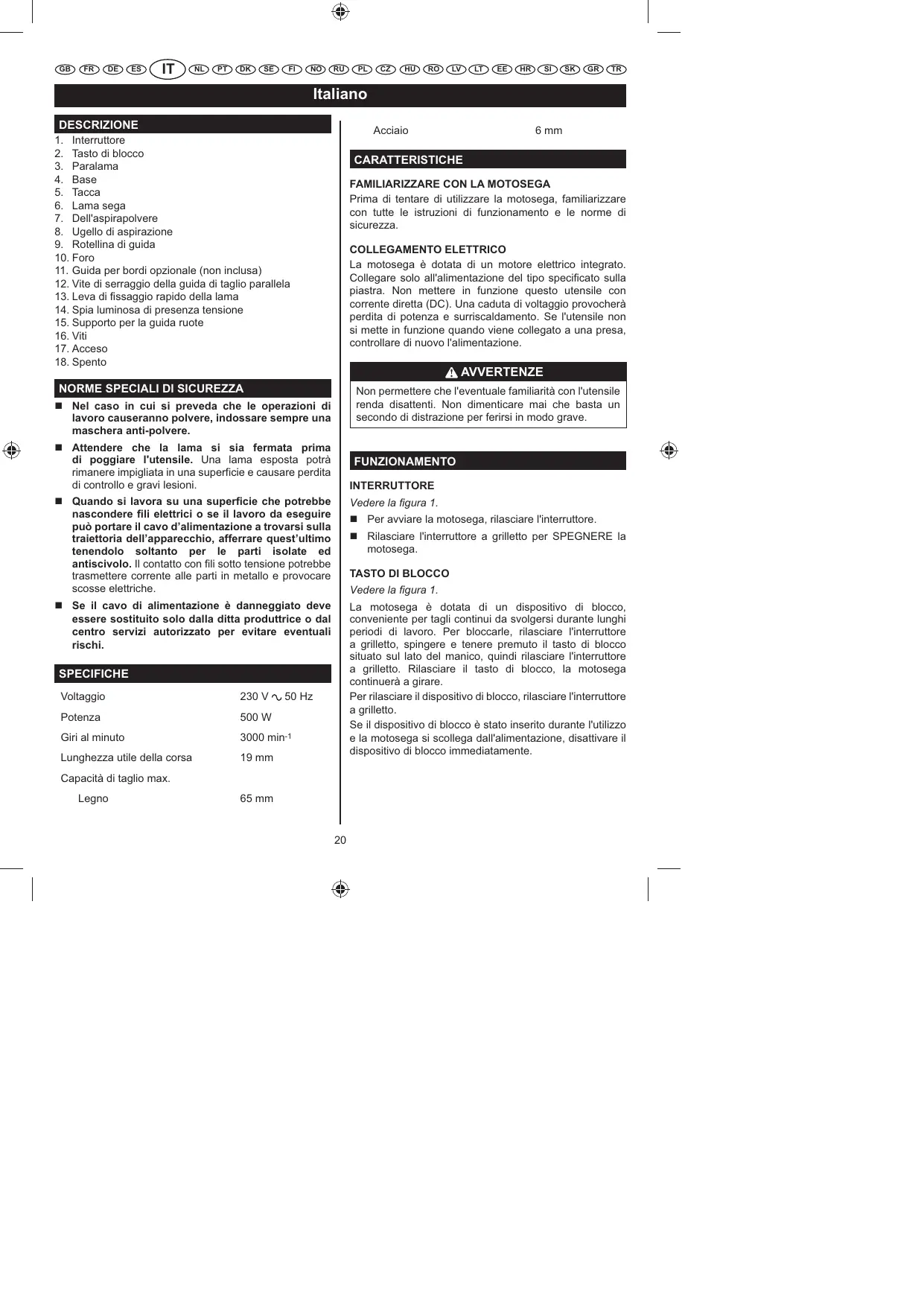 Vedere la gura 1. SPECIFICHE Voltaggio 230 V 50 Hz Potenza 500 W Giri al minuto 3000 min-1 Lunghezza utile della corsa 19 mm Capacità di taglio max. Legno 65 mm