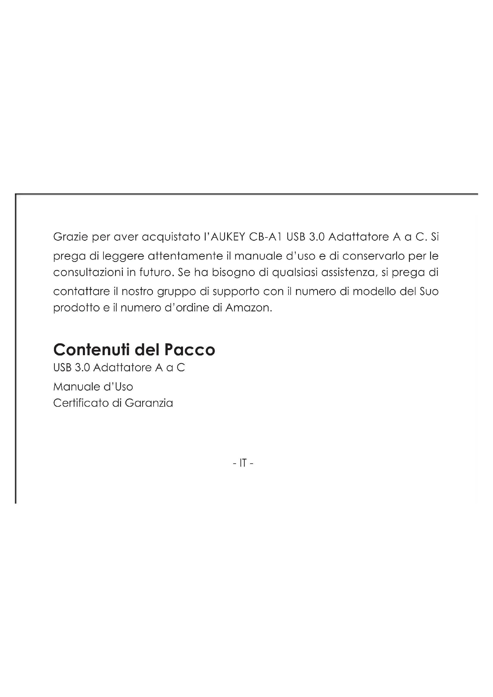 - Por favor, tenga en cuenta que AUKEY sólo puede ofrecer servicio postventa a los productos comprados directamente de AUKEY. Si usted ha comprado del vendedor diferente, por favor, póngase en contacto con ellos directamente sobre la garantía o los problemas de servicio.- IT - Grazie per aver acquistato l’AUKEY CB-A1 USB 3.0 Adattatore A a C. Si prega di leggere attentamente il manuale d’uso e di conservarlo per le consultazioni in futuro. Se ha bisogno di qualsiasi assistenza, si prega di contattare il nostro gruppo di supporto con il numero di modello del Suo prodotto e il numero d’ordine di Amazon. Contenuti del Pacco USB 3.0 Adattatore A a C Manuale d’Uso Certificato di Garanzia- IT - Modello Connettore Dimensioni Peso CB-A1 USB-C, USB-A 35 × 15,8 × 8,27mm / 1,2” × 0,62” × 0,32” 9g / 0,32oz Specificazioni- IT - Garanzia & Assistenza ai Clienti Per domande, supporto o richieste di garanzia, contattarci al seguente indirizzo che corrisponde alla Sua regione. Si prega d’inserire il Suo numero d’ordine di Amazon e di modello dei prodotti. Ordini di Amazon EU: support.eu@aukey.com