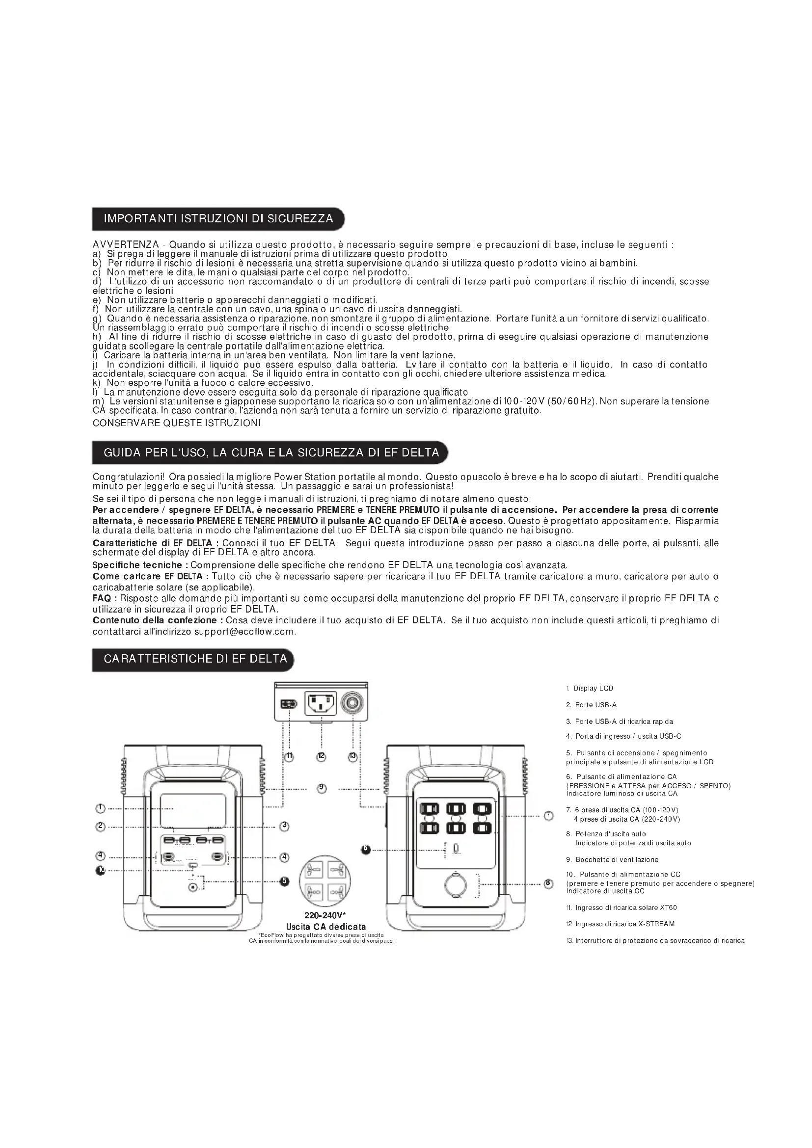 j) In condizioni difficili, il liquido può essere espulso dalla batteria. Evitare il contatto con la batteria e il liquido. In caso di contatto accidentale, sciacquare con acqua. Se il liquido entra in contatto con gli occhi, chiedere ulteriore assistenza medica. k) Non esporre l'unità a fuoco o calore eccessivo. l) La manutenzione deve essere eseguita solo da personale di riparazione qualificato m) Le versioni statunitense e giapponese supportano la ricarica solo con un’alimentazione di 100-120V (50/60Hz). Non superare la tensione CA specificata. In caso contrario, l'azienda non sarà tenuta a fornire un servizio di riparazione gratuito. Congratulazioni! Ora possiedi la migliore Power Station portatile al mondo. Questo opuscolo è breve e ha lo scopo di aiutarti. Prenditi qualche minuto per leggerlo e segui l'unità stessa. Un passaggio e sarai un professionista! Se sei il tipo di persona che non legge i manuali di istruzioni, ti preghiamo di notare almeno questo: Per accendere / spegnere EF DELTA, è necessario PREMERE e TENERE PREMUTO il pulsante di accensione. Per accendere la presa di corrente alternata, è necessario PREMERE E TENERE PREMUTO il pulsante AC quando EF DELTA è acceso. Questo è progettato appositamente. Risparmia la durata della batteria in modo che l'alimentazione del tuo EF DELTA sia disponibile quando ne hai bisogno. Caratteristiche di EF DELTA : Conosci il tuo EF DELTA. Segui questa introduzione passo per passo a ciascuna delle porte, ai pulsanti, alle schermate del display di EF DELTA e altro ancora. Specifiche tecniche : Comprensione delle specifiche che rendono EF DELTA una tecnologia così avanzata. Come caricare EF DELTA : Tutto ciò che è necessario sapere per ricaricare il tuo EF DELTA tramite caricatore a muro, caricatore per auto o caricabatterie solare (se applicabile). FAQ : Risposte alle domande più importanti su come occuparsi della manutenzione del proprio EF DELTA, conservare il proprio EF DELTA e utilizzare in sicurezza il proprio EF DELTA. Contenuto della confezione : Cosa deve includere il tuo acquisto di EF DELTA. Se il tuo acquisto non include questi articoli, ti preghiamo di contattarci all'indirizzo support@ecoflow.com. 1. Display LCD2. Porte USB-A3. Porte USB-A di ricarica rapida4. Porta di ingresso / uscita USB-C5. Pulsante di accensione / spegnimento principale e pulsante di alimentazione LCD6. Pulsante di alimentazione CA (PRESSIONE e ATTESA per ACCESO / SPENTO) Indicatore luminoso di uscita CA7. 6 prese di uscita CA (100-120V) 4 prese di uscita CA (220-240V)8. Potenza d'uscita auto Indicatore di potenza di uscita auto 9. Bocchette di ventilazione10. Pulsante di alimentazione CC(premere e tenere premuto per accendere o spegnere)Indicatore di uscita CC11. Ingresso di ricarica solare XT6012. Ingresso di ricarica X-STREAM13. Interruttore di protezione da sovraccarico di ricarica 220-240V* Uscita CA dedicata GUIDA PER L'USO, LA CURA E LA SICUREZZA DI EF DELTA