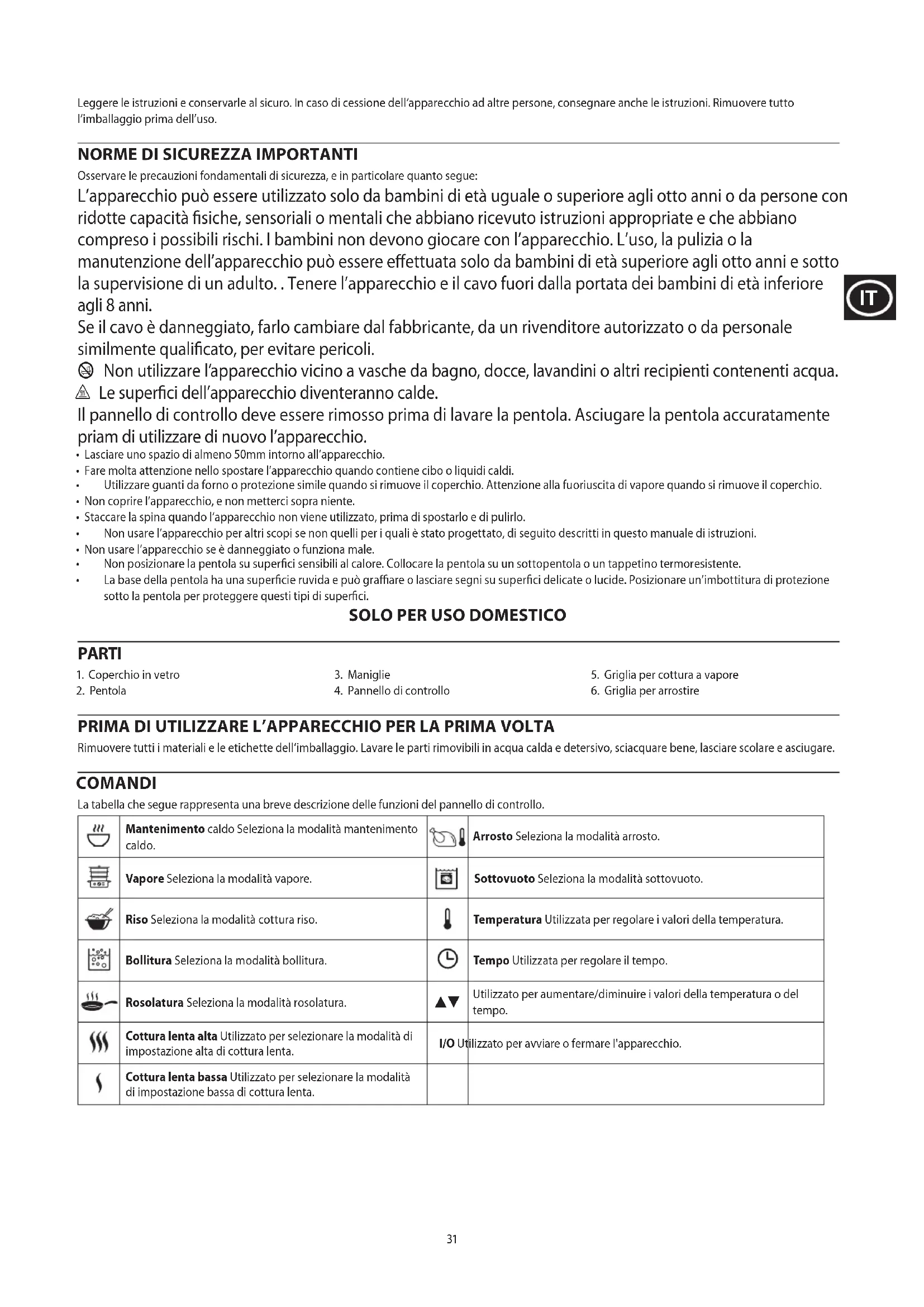 Osservare le precauzioni fondamentali di sicurezza, e in particolare quanto segue: L’apparecchio può essere utilizzato solo da bambini di età uguale o superiore agli otto anni o da persone con ridotte capacità siche, sensoriali o mentali che abbiano ricevuto istruzioni appropriate e che abbiano compreso i possibili rischi. I bambini non devono giocare con l’apparecchio. L’uso, la pulizia o la manutenzione dell’apparecchio può essere eettuata solo da bambini di età superiore agli otto anni e sotto la supervisione di un adulto. . Tenere l’apparecchio e il cavo fuori dalla portata dei bambini di età inferiore agli 8 anni. Se il cavo è danneggiato, farlo cambiare dal fabbricante, da un rivenditore autorizzato o da personale similmente qualicato, per evitare pericoli. b Non utilizzare l’apparecchio vicino a vasche da bagno, docce, lavandini o altri recipienti contenenti acqua. ¬ Le superci dell’apparecchio diventeranno calde. Il pannello di controllo deve essere rimosso prima di lavare la pentola. Asciugare la pentola accuratamente priam di utilizzare di nuovo l’apparecchio.