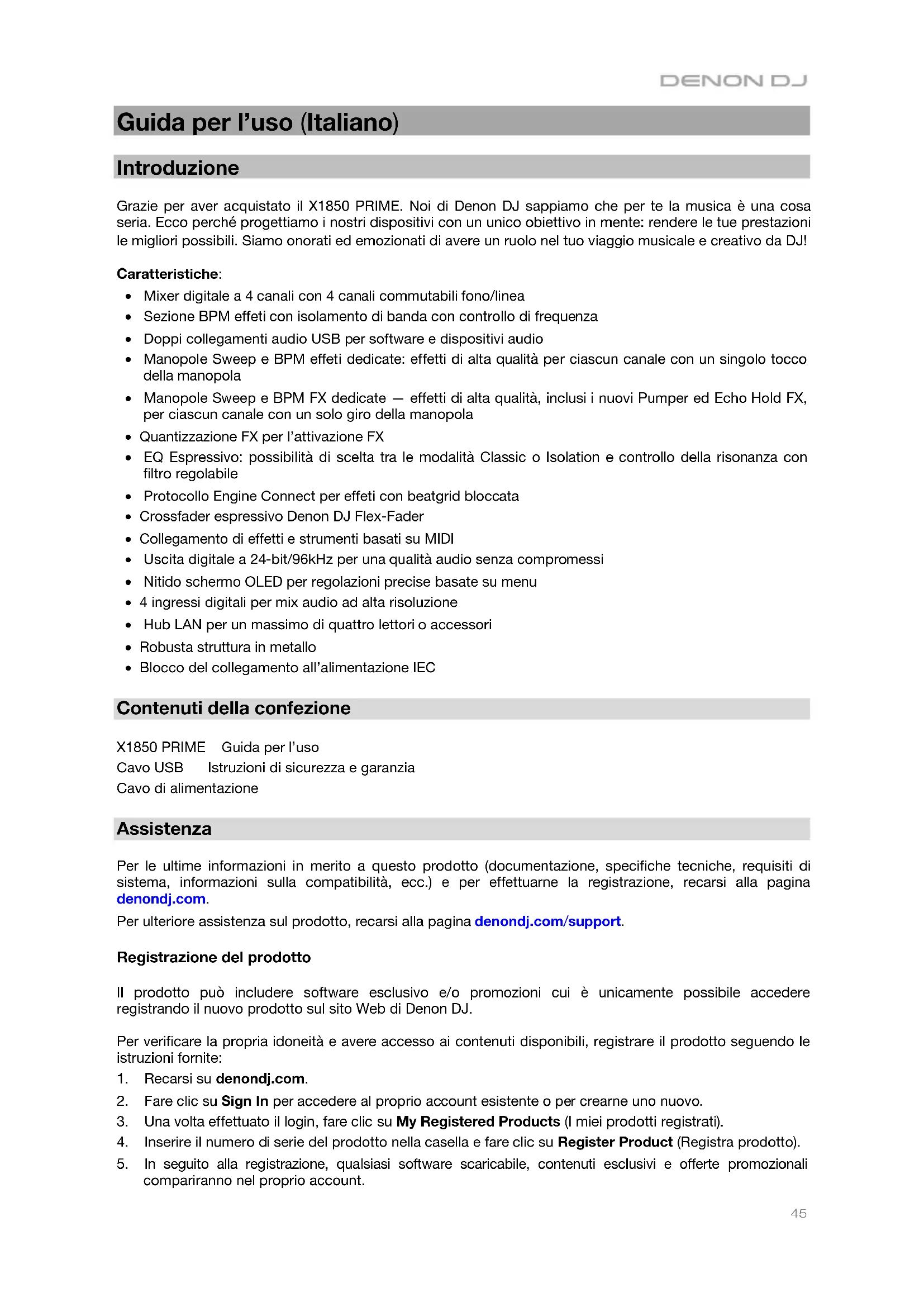 - Robusta struttura in metallo • Blocco del collegamento all’alimentazione IEC Contenuti della confezione X1850 PRIME Guida per l’uso Cavo USB Istruzioni di sicurezza e garanzia Cavo di alimentazione Assistenza Per le ultime informazioni in merito a questo prodotto (documentazione, specifiche tecniche, requisiti di sistema, informazioni sulla compatibilità, ecc.) e per effettuarne la registrazione, recarsi alla pagina denondj.com. Per ulteriore assistenza sul prodotto, recarsi alla pagina denondj.com/support. Registrazione del prodotto Il prodotto può includere software esclusivo e/o promozioni cui è unicamente possibile accedere registrando il nuovo prodotto sul sito Web di Denon DJ. Per verificare la propria idoneità e avere accesso ai contenuti disponibili, registrare il prodotto seguendo le istruzioni fornite: