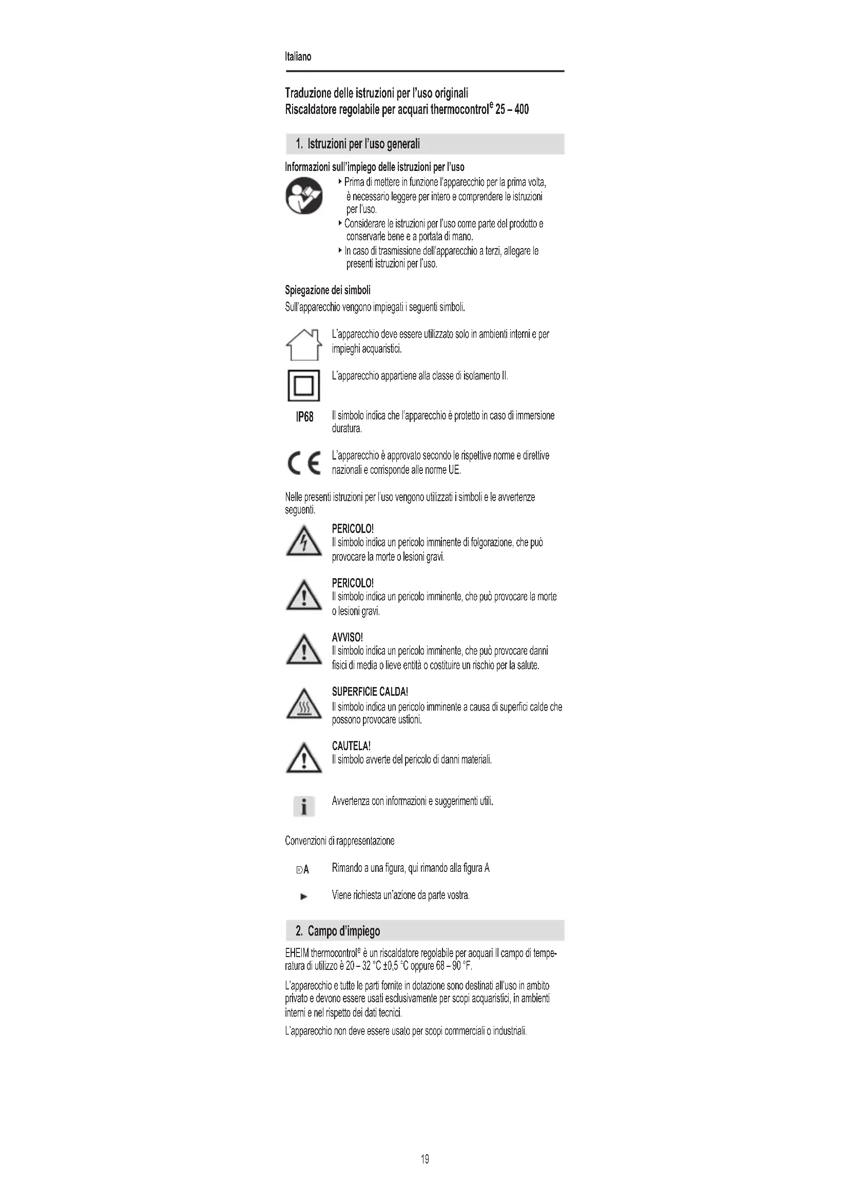 Informazioni sull’impiego delle istruzioni per l’uso ▶ Prima di mettere in funzione l’apparecchio per la prima volta, è necessario leggere per intero e comprendere le istruzioni per l’uso. ▶ Considerare le istruzioni per l’uso come parte del prodotto e conservarle bene e a portata di mano. ▶ In caso di trasmissione dell’apparecchio a terzi, allegare le presenti istruzioni per l’uso. Spiegazione dei simboli Sull’apparecchio vengono impiegati i seguenti simboli. L’apparecchio deve essere utilizzato solo in ambienti interni e per impieghi acquaristici. L’apparecchio appartiene alla classe di isolamento II. Il simbolo indica che l’apparecchio è protetto in caso di immersione duratura. L’apparecchio è approvato secondo le rispettive norme e direttive nazionali e corrisponde alle norme UE. Nelle presenti istruzioni per l’uso vengono utilizzati i simboli e le avvertenze seguenti. PERICOLO! Il simbolo indica un pericolo imminente di folgorazione, che può provocare la morte o lesioni gravi. PERICOLO! Il simbolo indica un pericolo imminente, che può provocare la morte o lesioni gravi. AVVISO! Il simbolo indica un pericolo imminente, che può provocare danni sici di media o lieve entità o costituire un rischio per la salute. SUPERFICIE CALDA! Il simbolo indica un pericolo imminente a causa di superci calde che possono provocare ustioni. CAUTELA! Il simbolo avverte del pericolo di danni materiali. Avvertenza con informazioni e suggerimenti utili. Convenzioni di rappresentazione Rimando a una gura, qui rimando alla gura A Viene richiesta un’azione da parte vostra.