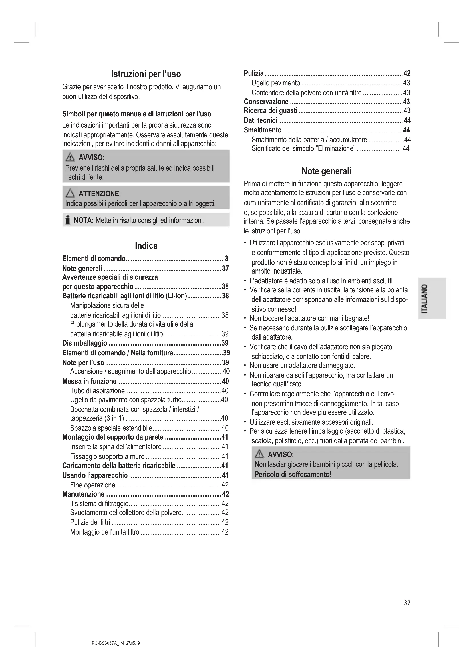 - La temperatura di stoccaggio deve essere compresa tra 0 °C e 40 °C. Ricerca dei guasti Problema Possibile causa Rimedio L’apparecchio non funziona. L’alimentatore è collegato. Scollegare l’apparecchio dall’alimentatore. La batteria ricaricabile è difettosa. Contattare il centro assistenza o il vostro rivenditore. Quando l’apparecchio è ac- ceso, tutte gli indicatori lumi- nosi iniziano a lampeggiare. La batteria ricaricabile é scarica. Ricaricare la batteria. Potenza di aspirazione debole. La batteria ricaricabile è quasi scarica. Ricaricare la batteria. Il contenitore della polvere è pieno. Svuotare il contenitore della polvere. I filtri sono sporchi. Pulire i filtri come descritto in “Manutenzione”. ATTENZIONE: Riutilizzare l’apparecchio solo una volta puliti i filtri!PC-BS3037A_IM 27.05.19