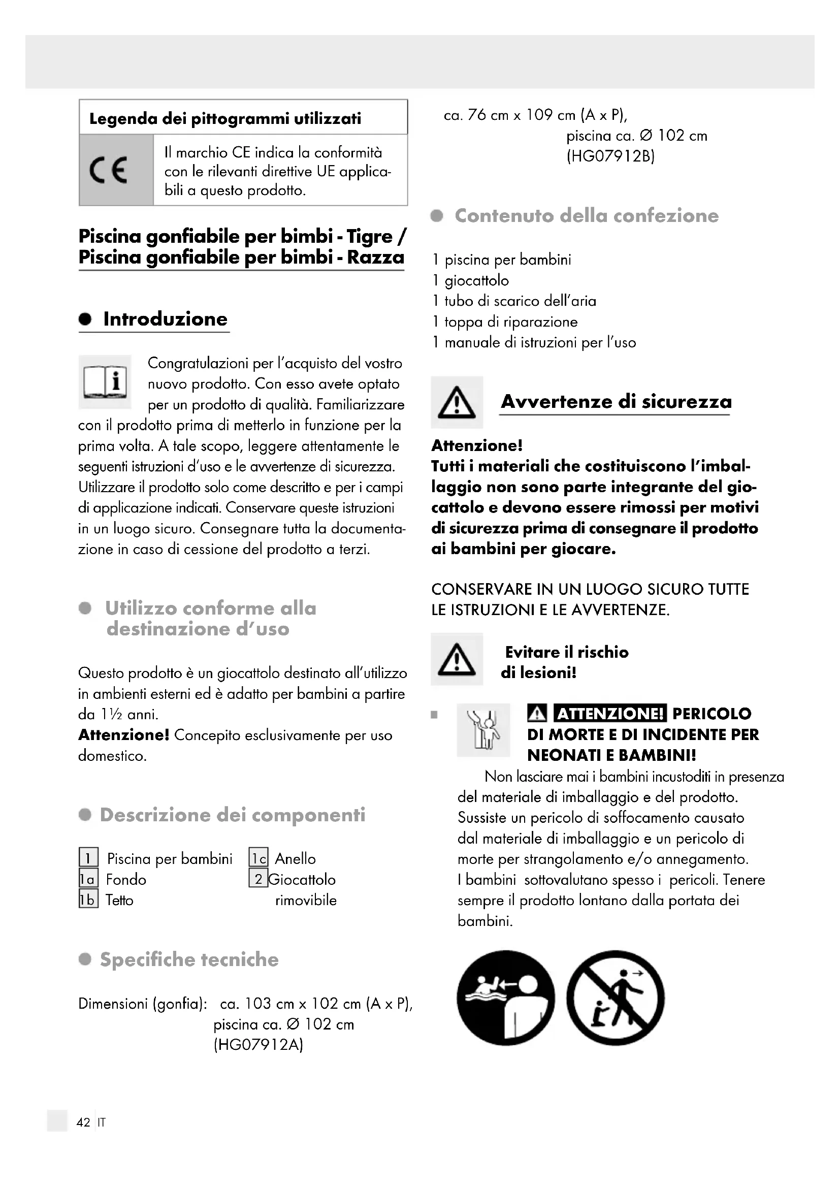 Giocattolo rimovibile Specifiche tecniche Dimensioni (gonfia): ca. 103 cm x 102 cm (A x P), piscina ca. Ø 102 cm (HG07912A) ca. 76 cm x 109 cm (A x P), piscina ca. Ø 102 cm (HG07912B) Contenuto della confezione 1 piscina per bambini 1 giocattolo 1 tubo di scarico dell’aria 1 toppa di riparazione 1 manuale di istruzioni per l’uso Avvertenze di sicurezza Attenzione! Tutti i materiali che costituiscono l’imbal- laggio non sono parte integrante del gio- cattolo e devono essere rimossi per motivi di sicurezza prima di consegnare il prodotto ai bambini per giocare.