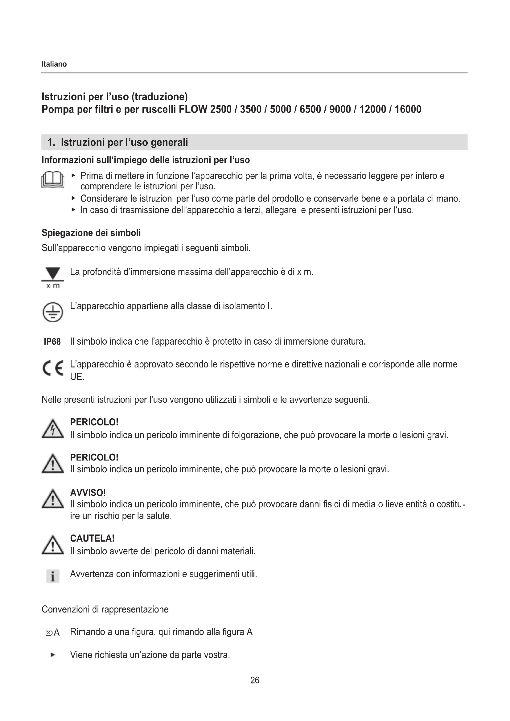 Informazioni sull‘impiego delle istruzioni per l‘uso ▶ Prima di mettere in funzione l‘apparecchio per la prima volta, è necessario leggere per intero e comprendere le istruzioni per l‘uso. ▶ Considerare le istruzioni per l‘uso come parte del prodotto e conservarle bene e a portata di mano. ▶ In caso di trasmissione dell‘apparecchio a terzi, allegare le presenti istruzioni per l‘uso. Spiegazione dei simboli Sull’apparecchio vengono impiegati i seguenti simboli. La profondità d’immersione massima dell’apparecchio è di x m. L’apparecchio appartiene alla classe di isolamento I. Il simbolo indica che l’apparecchio è protetto in caso di immersione duratura. L’apparecchio è approvato secondo le rispettive norme e direttive nazionali e corrisponde alle norme UE. Nelle presenti istruzioni per l’uso vengono utilizzati i simboli e le avvertenze seguenti. PERICOLO! Il simbolo indica un pericolo imminente di folgorazione, che può provocare la morte o lesioni gravi. PERICOLO! Il simbolo indica un pericolo imminente, che può provocare la morte o lesioni gravi. AVVISO! Il simbolo indica un pericolo imminente, che può provocare danni sici di media o lieve entità o costitu