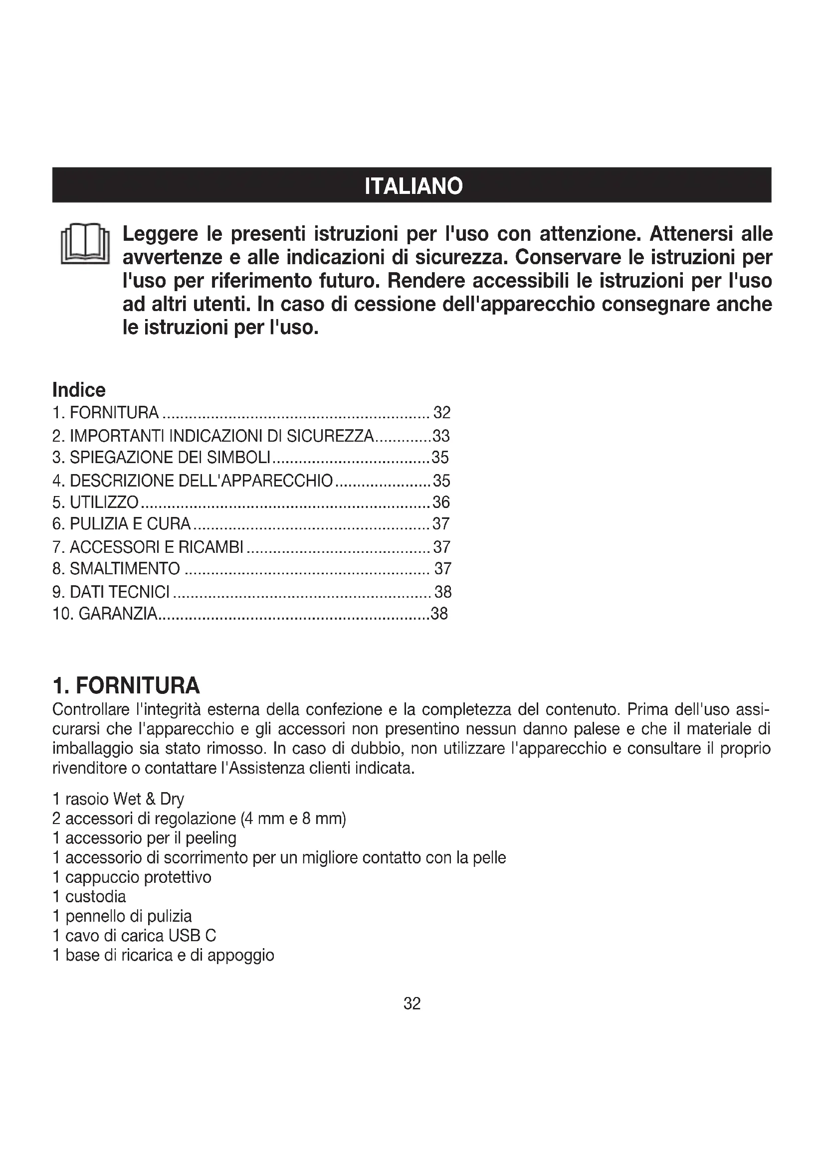 Controllare l'integrità esterna della confezione e la completezza del contenuto. Prima dell'uso assi- curarsi che l'apparecchio e gli accessori non presentino nessun danno palese e che il materiale di imballaggio sia stato rimosso. In caso di dubbio, non utilizzare l'apparecchio e consultare il proprio rivenditore o contattare l'Assistenza clienti indicata. 1 rasoio Wet & Dry 2 accessori di regolazione (4 mm e 8 mm) 1 accessorio per il peeling 1 accessorio di scorrimento per un migliore contatto con la pelle 1 cappuccio protettivo 1 custodia 1 pennello di pulizia 1 cavo di carica USB C 1 base di ricarica e di appoggio ITALIANO Leggere le presenti istruzioni per l'uso con attenzione. Attenersi alle avvertenze e alle indicazioni di sicurezza. Conservare le istruzioni per l'uso per riferimento futuro. Rendere accessibili le istruzioni per l'uso ad altri utenti. In caso di cessione dell'apparecchio consegnare anche le istruzioni per l'uso.