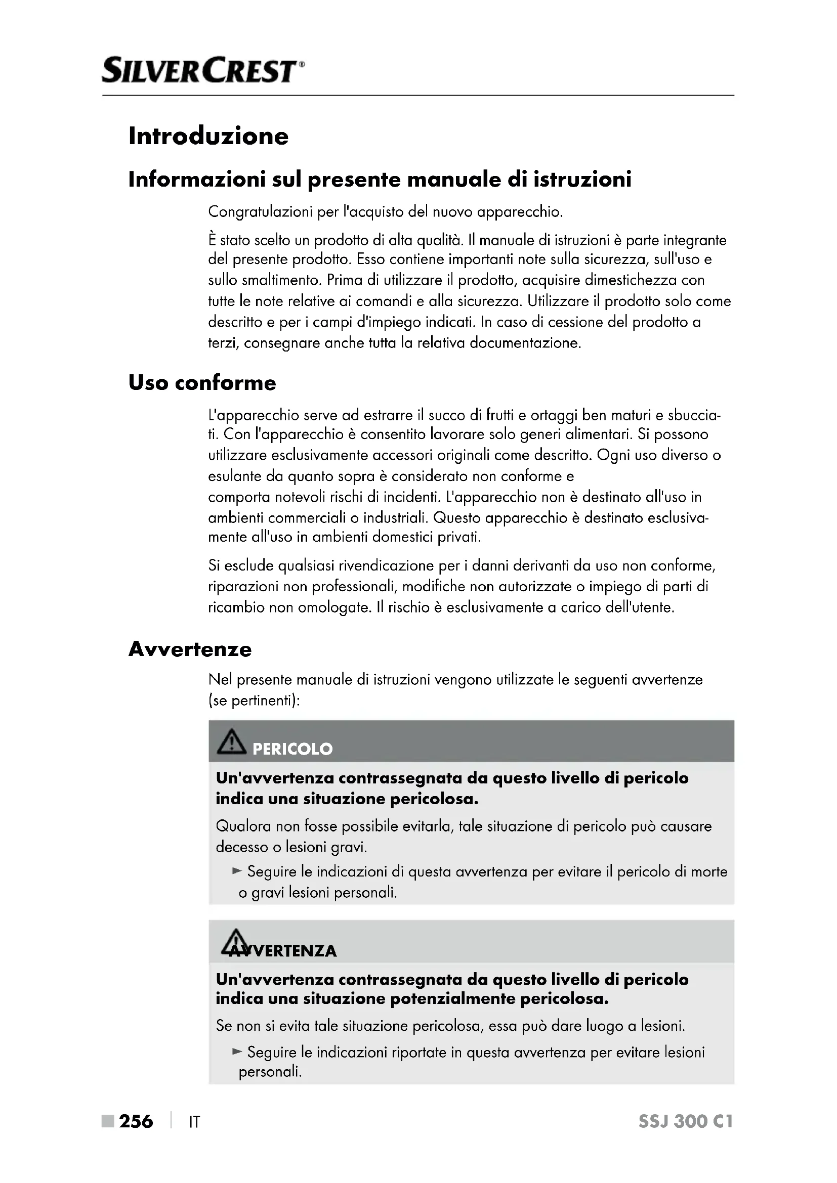 IT SSJ 300 C1 Introduzione Informazioni sul presente manuale di istruzioni Congratulazioni per l'acquisto del nuovo apparecchio. È stato scelto un prodotto di alta qualità. Il manuale di istruzioni è parte integrante del presente prodotto. Esso contiene importanti note sulla sicurezza, sull'uso e sullo smaltimento. Prima di utilizzare il prodotto, acquisire dimestichezza con tutte le note relative ai comandi e alla sicurezza. Utilizzare il prodotto solo come descritto e per i campi d'impiego indicati. In caso di cessione del prodotto a terzi, consegnare anche tutta la relativa documentazione. Uso conforme L'apparecchio serve ad estrarre il succo di frutti e ortaggi ben maturi e sbuccia- ti. Con l'apparecchio è consentito lavorare solo generi alimentari. Si possono utilizzare esclusivamente accessori originali come descritto. Ogni uso diverso o esulante da quanto sopra è considerato non conforme e comporta notevoli rischi di incidenti. L'apparecchio non è destinato all'uso in ambienti commerciali o industriali. Questo apparecchio è destinato esclusiva- mente all'uso in ambienti domestici privati. Si esclude qualsiasi rivendicazione per i danni derivanti da uso non conforme, riparazioni non professionali, modifiche non autorizzate o impiego di parti di ricambio non omologate. Il rischio è esclusivamente a carico dell'utente. Avvertenze Nel presente manuale di istruzioni vengono utilizzate le seguenti avvertenze (se pertinenti): PERICOLO Un'avvertenza contrassegnata da questo livello di pericolo indica una situazione pericolosa. Qualora non fosse possibile evitarla, tale situazione di pericolo può causare decesso o lesioni gravi. ► Seguire le indicazioni di questa avvertenza per evitare il pericolo di morte o gravi lesioni personali. AVVERTENZA Un'avvertenza contrassegnata da questo livello di pericolo indica una situazione potenzialmente pericolosa. Se non si evita tale situazione pericolosa, essa può dare luogo a lesioni. ► Seguire le indicazioni riportate in questa avvertenza per evitare lesioni personali.IT
