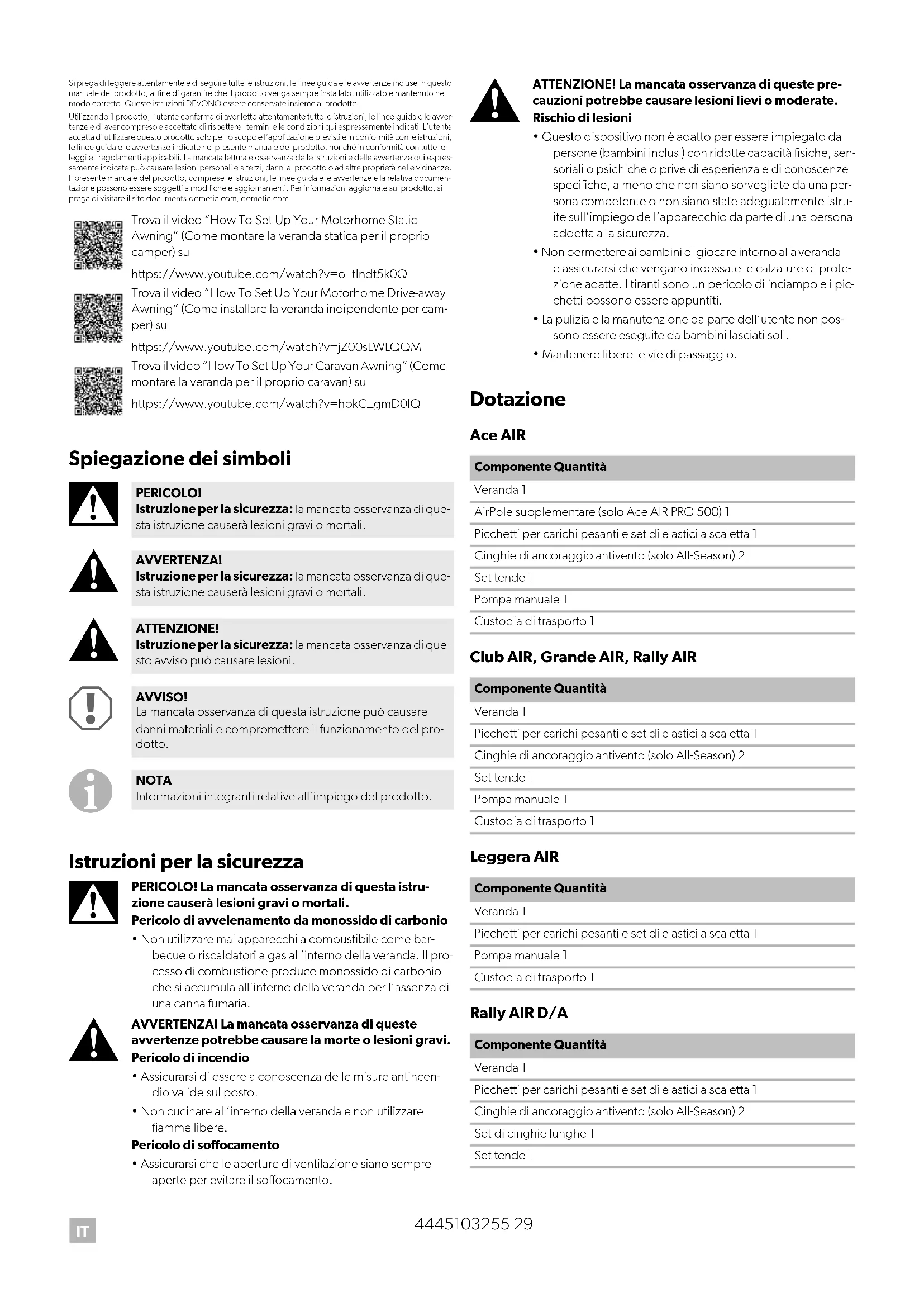 - Mantenere libere le vie di passaggio. Dotazione Ace AIR Club AIR, Grande AIR, Rally AIR Leggera AIR Rally AIR D/A Trova il video “How To Set Up Your Motorhome Static Awning” (Come montare la veranda statica per il proprio camper) su https://www.youtube.com/watch?v=o_tIndt5k0Q Trova il video “How To Set Up Your Motorhome Drive-away Awning” (Come installare la veranda indipendente per cam- per) su https://www.youtube.com/watch?v=jZ00sLWLQQM Trova il video “How To Set Up Your Caravan Awning” (Come montare la veranda per il proprio caravan) su https://www.youtube.com/watch?v=hokC_gmD0lQ PERICOLO! Istruzione per la sicurezza: la mancata osservanza di que- sta istruzione causerà lesioni gravi o mortali. AVVERTENZA! Istruzione per la sicurezza: la mancata osservanza di que- sta istruzione causerà lesioni gravi o mortali. ATTENZIONE! Istruzione per la sicurezza: la mancata osservanza di que- sto avviso può causare lesioni. AVVISO! La mancata osservanza di questa istruzione può causare danni materiali e compromettere il funzionamento del pro- dotto. NOTA Informazioni integranti relative all’impiego del prodotto. Componente Quantità Veranda 1 AirPole supplementare (solo Ace AIR PRO 500) 1 Picchetti per carichi pesanti e set di elastici a scaletta 1 Cinghie di ancoraggio antivento (solo All-Season) 2 Set tende 1 Pompa manuale 1 Custodia di trasporto 1 Componente Quantità Veranda 1 Picchetti per carichi pesanti e set di elastici a scaletta 1 Cinghie di ancoraggio antivento (solo All-Season) 2 Set tende 1 Pompa manuale 1 Custodia di trasporto 1 Componente Quantità Veranda 1 Picchetti per carichi pesanti e set di elastici a scaletta 1 Pompa manuale 1 Custodia di trasporto 1 Componente Quantità Veranda 1 Picchetti per carichi pesanti e set di elastici a scaletta 1 Cinghie di ancoraggio antivento (solo All-Season) 2 Set di cinghie lunghe 1 Set tende 1IT