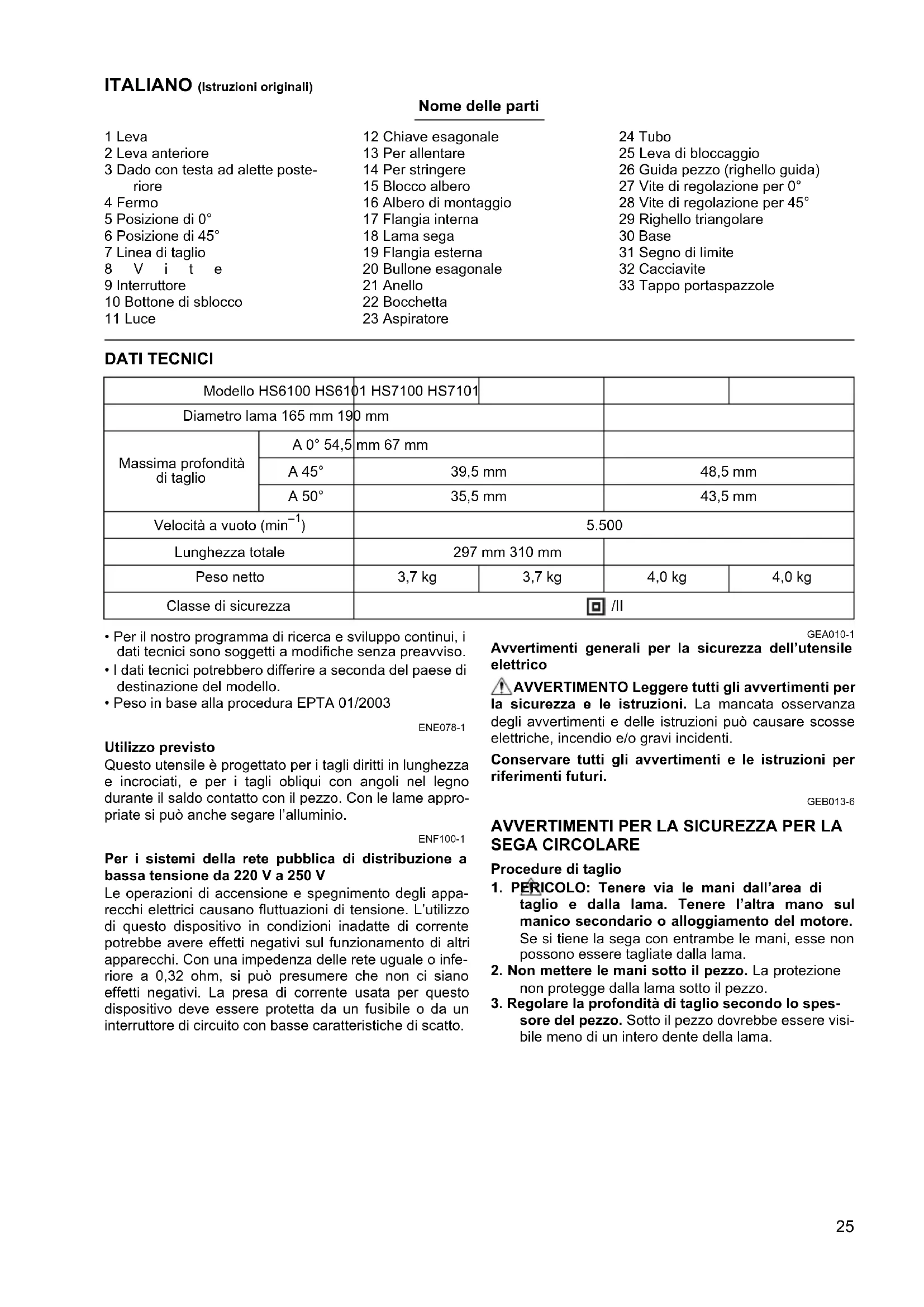 sore del pezzo. Sotto il pezzo dovrebbe essere visi- bile meno di un intero dente della lama. Modello HS6100 HS6101 HS7100 HS7101 Diametro lama 165 mm 190 mm Massima profondità di taglio A 0° 54,5 mm 67 mm A 45° 39,5 mm 48,5 mm A 50° 35,5 mm 43,5 mm Velocità a vuoto (min