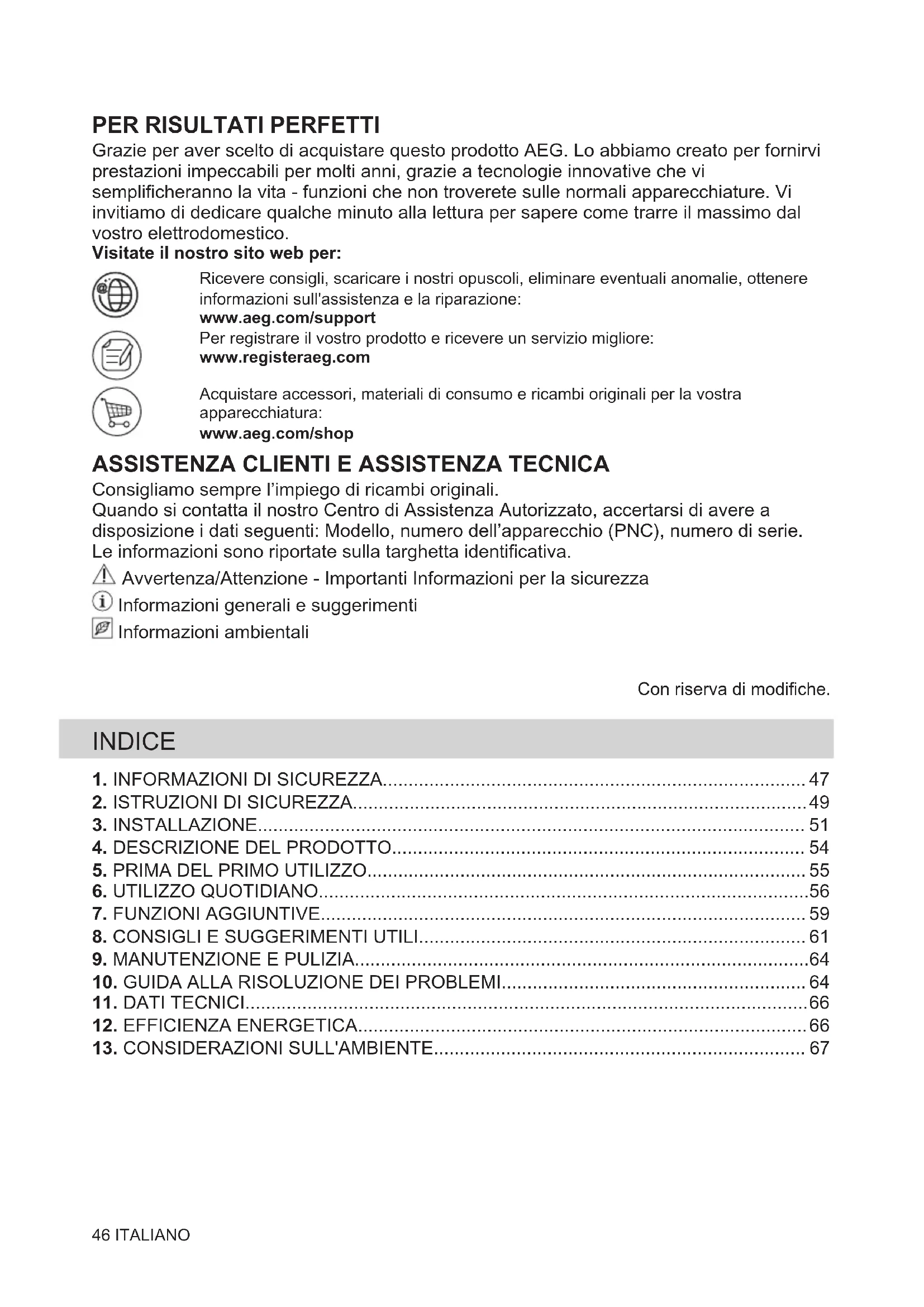 Grazie per aver scelto di acquistare questo prodotto AEG. Lo abbiamo creato per fornirvi prestazioni impeccabili per molti anni, grazie a tecnologie innovative che vi semplificheranno la vita - funzioni che non troverete sulle normali apparecchiature. Vi invitiamo di dedicare qualche minuto alla lettura per sapere come trarre il massimo dal vostro elettrodomestico. Visitate il nostro sito web per: Ricevere consigli, scaricare i nostri opuscoli, eliminare eventuali anomalie, ottenere informazioni sull'assistenza e la riparazione: www.aeg.com/support Per registrare il vostro prodotto e ricevere un servizio migliore: www.registeraeg.com Acquistare accessori, materiali di consumo e ricambi originali per la vostra apparecchiatura: www.aeg.com/shop