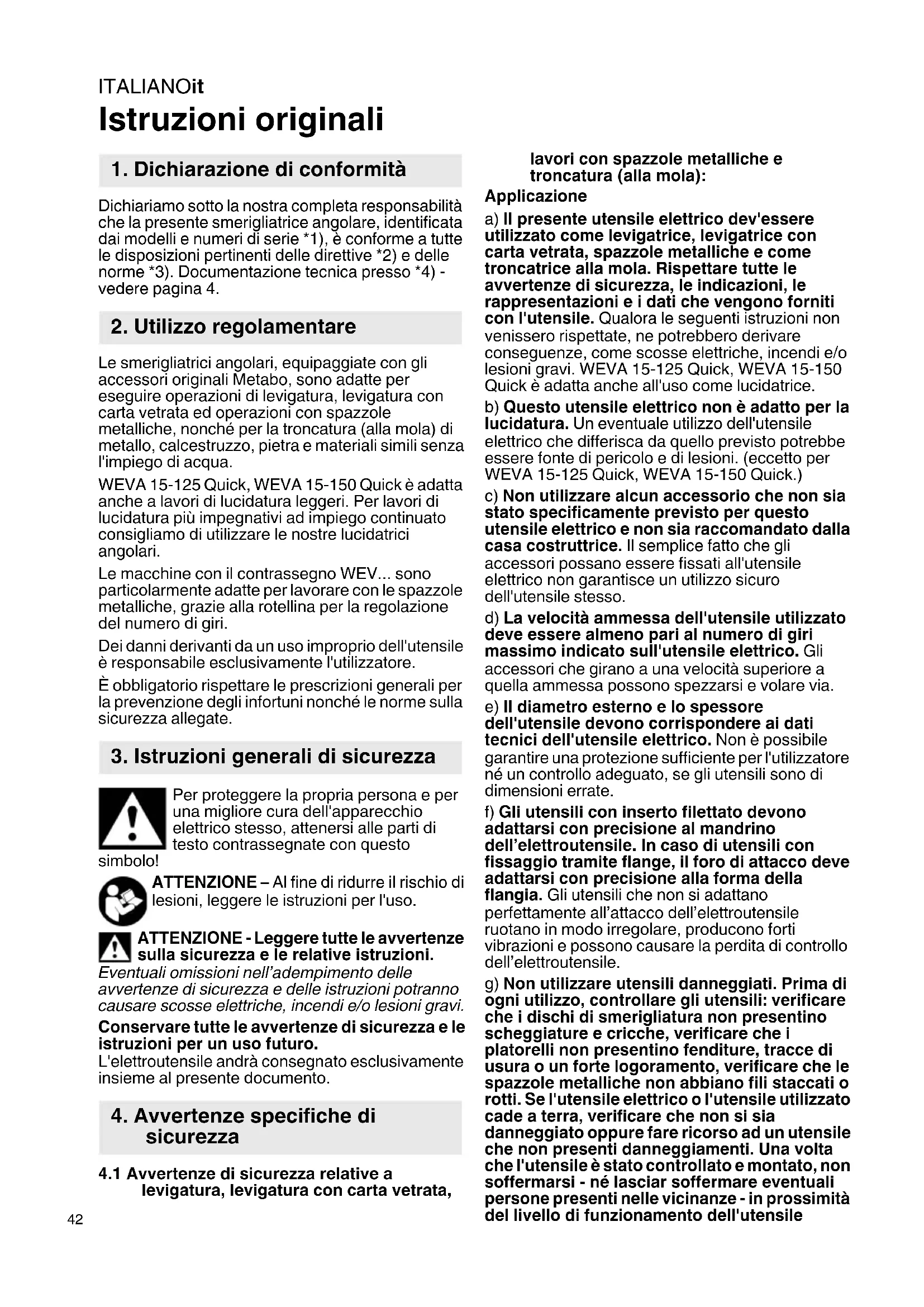 Istruzioni originali Dichiariamo sotto la nostra completa responsabilità che la presente smerigliatrice angolare, identificata dai modelli e numeri di serie *1), è conforme a tutte le disposizioni pertinenti delle direttive *2) e delle norme *3). Documentazione tecnica presso *4) - vedere pagina 4. Le smerigliatrici angolari, equipaggiate con gli accessori originali Metabo, sono adatte per eseguire operazioni di levigatura, levigatura con carta vetrata ed operazioni con spazzole metalliche, nonché per la troncatura (alla mola) di metallo, calcestruzzo, pietra e materiali simili senza l'impiego di acqua. WEVA 15-125 Quick, WEVA 15-150 Quick è adatta anche a lavori di lucidatura leggeri. Per lavori di lucidatura più impegnativi ad impiego continuato consigliamo di utilizzare le nostre lucidatrici angolari. Le macchine con il contrassegno WEV... sono particolarmente adatte per lavorare con le spazzole metalliche, grazie alla rotellina per la regolazione del numero di giri. Dei danni derivanti da un uso improprio dell'utensile è responsabile esclusivamente l'utilizzatore. È obbligatorio rispettare le prescrizioni generali per la prevenzione degli infortuni nonché le norme sulla sicurezza allegate. Per proteggere la propria persona e per una migliore cura dell'apparecchio elettrico stesso, attenersi alle parti di testo contrassegnate con questo simbolo! ATTENZIONE – Al fine di ridurre il rischio di lesioni, leggere le istruzioni per l'uso. ATTENZIONE - Leggere tutte le avvertenze sulla sicurezza e le relative istruzioni. Eventuali omissioni nell’adempimento delle avvertenze di sicurezza e delle istruzioni potranno causare scosse elettriche, incendi e/o lesioni gravi. Conservare tutte le avvertenze di sicurezza e le istruzioni per un uso futuro. L'elettroutensile andrà consegnato esclusivamente insieme al presente documento.