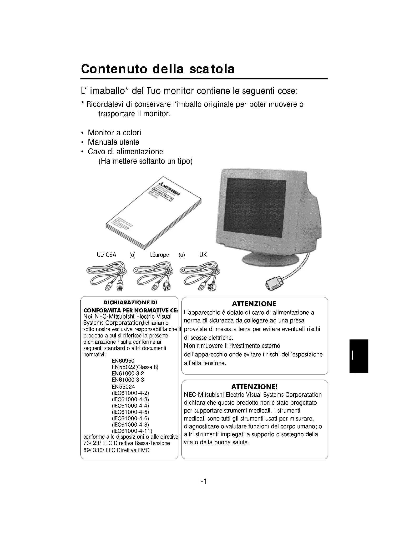 - Cavo di alimentazione (Ha mettere soltanto un tipo) ATTENZIONE L’apparecchio è dotato di cavo di alimentazione a norma di sicurezza da collegare ad una presa provvista di messa a terra per evitare eventuali rischi di scosse elettriche. Non rimuovere il rivestimento esterno dell’apparecchio onde evitare i rischi dell’esposizione all’alta tensione. DICHIARAZIONE DIC O N F O R M I T A PER NORMATIVE CE:Noi, NEC-Mitsubishi Electric Vi s u a l Systems Corporatation, d i c h i a r i a rn osotto nostra esclusiva responsabilita che ilp r odotto a cui si riferisce la pre s e n t edichiarazione risulta conforme aiseguenti standard o altri documentin o rm a t i v i :E N 6 0 9 5 0EN55022(Classe B) E N 6 1 0 0 0 - 3 - 2E N 6 1 0 0 0 - 3 - 3EN55024(IEC61000-4-2)(IEC61000-4-3)(IEC61000-4-4)(IEC61000-4-5)(IEC61000-4-6)(IEC61000-4-8)(IEC61000-4-11)c o n f o rme alle disposizioni o alle dire t t i v e :73/23/EEC Direttiva Bassa-Te n s i o n e89/336/EEC Direttiva EMC ATTENZIONE! NEC-Mitsubishi Electric Visual Systems Corporatation dichiara che questo prodotto non è stato progettato per supportare strumenti medicali. I strumenti medicali sono tutti gli strumenti usati per misurare, diagnosticare o valutare funzioni del corpo umano; o altri strumenti impiegati a supporto o sostegno della vita o della buona salute. UL/CSA (o) Léurope (o) UKI-2 Come cominciare Se volete collegare il monitor vostro sistema, seguite le sottoindicate istruzioni: 1 Spegnete il computer e il monitor. 2 Se necessario, installate la scheda video. Per i dettagli, consultate il manuale della scheda. 3 Per PC: Connettere il connettore 15-pin.mini-D-SUB al connettore della scheda video del Vostro sistema (Figura A.1). Avvitate bene tutte le viti. Per Mac: Connettere l‘adattatore Macintosh per il connettore video sul Macintosh (Figura B.1). Connettere il connettore 15-pin-mini-D-SUB al connettore sul computer (Figura B.1). Avvitate bene tutte le viti. 4 Collegate il cavo di alimentazione al monitor e alla presa di corrente (Figura C.1). 5 Accendete il vostro monitor (Figura D.1) e il computer. 6 A questo punto l‘installazione é completata. NOTA: Se avete dei problemi, consultate la sezione del manuale “Soluzione dei Problemi più comuni”. Cavo segnale in dotazione 15-pin-mini-D-SUB Figura A.1I I-3 ATTENZIONE L’alimentazione del questo monitor resta attiva anche quando l’interruttore di alimentazione è spento. Pertanto, è opportuno che la presa di alimentazione sia facilmente accessibile in caso di emergenza o per scollegare completamente il monitor. Cavo segnale in dotazione computer Presa di corrente Cavo di alimentazione l‘adattatore Macintosh 15-pin-mini-D-SUB Figura B.1 Figura C.1 Figura D.1I-4 Controlli I tasti OSD collocati sulla parte frontale del monitor hanno le seguenti funzioni: SELECT Entra ed esci dal menu OSD. -/+ Seleziona uno dei controlli e diminuisce ed aumenta l‘aggiustamento. RESET Resetta il controllo illuminato alle impostazioni di fabbrica. Spingete il bottone -/+ allo stesso momento per circa un sec. Luminosita‘: Aggiusta la luminosita‘ dell‘immagine e dallo scherno. Contrasto: Aggiusta la luminosita‘ dell‘immagine in relazione allo sfondo. (Il controllo del contrasto funziona con i pulsanti “-,+” anche la finestra OSD non e‘ attiva.) R Controllo del colore rosso: Aggiusta il contrasto del rosso sullo schermo. G Controllo del colore verde: Aggiusta il contrasto del verde sullo schermo. B Controllo del colore Blu: Aggiusta il contrasto del blu sullo schermo. Posizione orizzontale: Muove l‘immagine orizzontale a destra ed a sinistra. Posizione verticale: Muove l‘immagine verticale su e giu‘. Dimensione orizzontale: Aumenta e diminuisce la dimensione orizzontale dell‘immagine. Dimensione verticale: Aumenta e diminuisce la dimensione verticale dell‘immagine. I controlli di Geometria permettono di aggiustare la curvatura e l‘angolatura dell‘immagine ai bordi del tuo display. Cuscion/Barile: Aumenta e diminuisce la curvatura dei lati verso l‘interno e verso l‘esterno.I I-5 Trapezio: Aumenta e diminuisce la parte bassa dello schermo in modo che sia come quella superiore. Parallelogramma: Aumenta e diminuisce l‘inclinazione dei lati a destra o a sinistra. Arco (Bilanciamento del cuscino): Aumenta e diminuisce la curvatura dei lati a destra o a sinistra. Rotazione: ruota l‘immagine. Degauss: Selezionate l‘icona degauss dalla “Finestra selezione Icone” e spingete il pulsante “SELEZIONA”. Questo eliminera‘ il campo magnetico latente sullo schermo e correggera‘ il raggio di elettroni; influenzera‘ la purezza il fuoco e la convergenza. Nota:Lasciate trascorrere almeno 20 minuti tra un utilizzo ed un altro della funzione degauss. 9300K Temperatura colore: Selezione l‘icona della Temperatura colore sulla “Finestra dei selezione delle Icone” e spingete il pulsante “Seleziona”. OSD: Vi sono 3 colori dello sfondo (Blu, Nero e bianco). Questi possono essere selezionati attraverso il pulsante “Seleziona” dopo avere scelto l‘“OSD” dalla “Finestra di selezione delle icone”. exit EXIT: Per uscire dalla finestra dell‘ OSD. Selezionate “EXIT” dalla “Finestra di selezione delle icone”, poi spingete il pulsante “Seleziona” per uscire dalla finestra dell‘ OSD. Nota:Se non selezionate alcuna icona in modalita‘ OSD per piu‘ di 10 secondi, la finestra scomparira‘ automaticamente.I-6 Raccomandazioni per l‘uso Precauzioni di sicurezza e manutenzione. PER UNA RESA OTTIMALE, SEGUIRE LE SEGUENTI